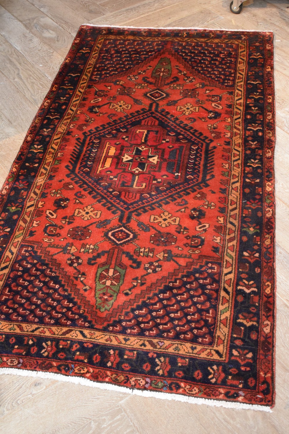 A TRIBAL PERSIAN ABHAR RUG, 100% WOOL IN EXCELLENT CONDITION, HAND KNOTTED VILLAGE WEAVE WITH TRIBAL DESIGN OF BOLD LATCH HOOKED AND ANCHORED MEDALLION AND CORNER MEDALLIONS IN A CORAL-TONED FIELD OF FLORAL PATTERNS, BORDER OF FLORAL MOTIFS, SIZE 204 X 105CM, ORIGIN PERSIA, RRP $1,400