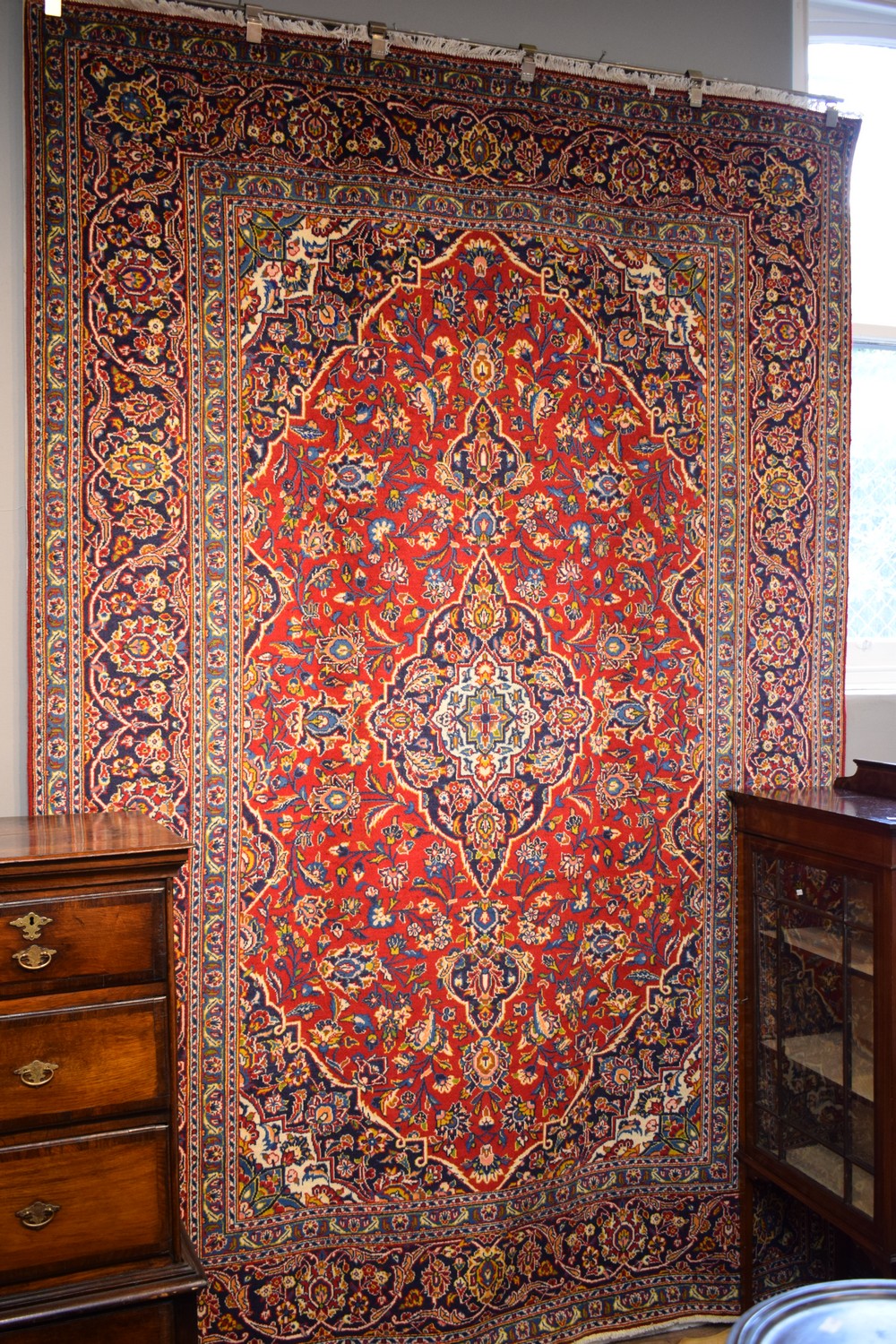 AN AUTHENTIC HAND KNOTTED PERSIAN KASHAN CARPET, 100% DENSE WOOL PILE IN SUPERB CONDITION, CLASSIC KASHAN BOOK COVER DESIGN OF ELONGATED FLORAL MEDALLION AND CORNER MEDALLIONS IN A RED FIELD OF SHAH ABBASSI PALMETTES, FLORAL SPRAYS AND TENDRILS, STURDY AND HARD WEARING, EX-GALLERY STOCK, SIZE 310 X 210CM, ORIGIN KASHAN/PERSIA, RRP $3,900