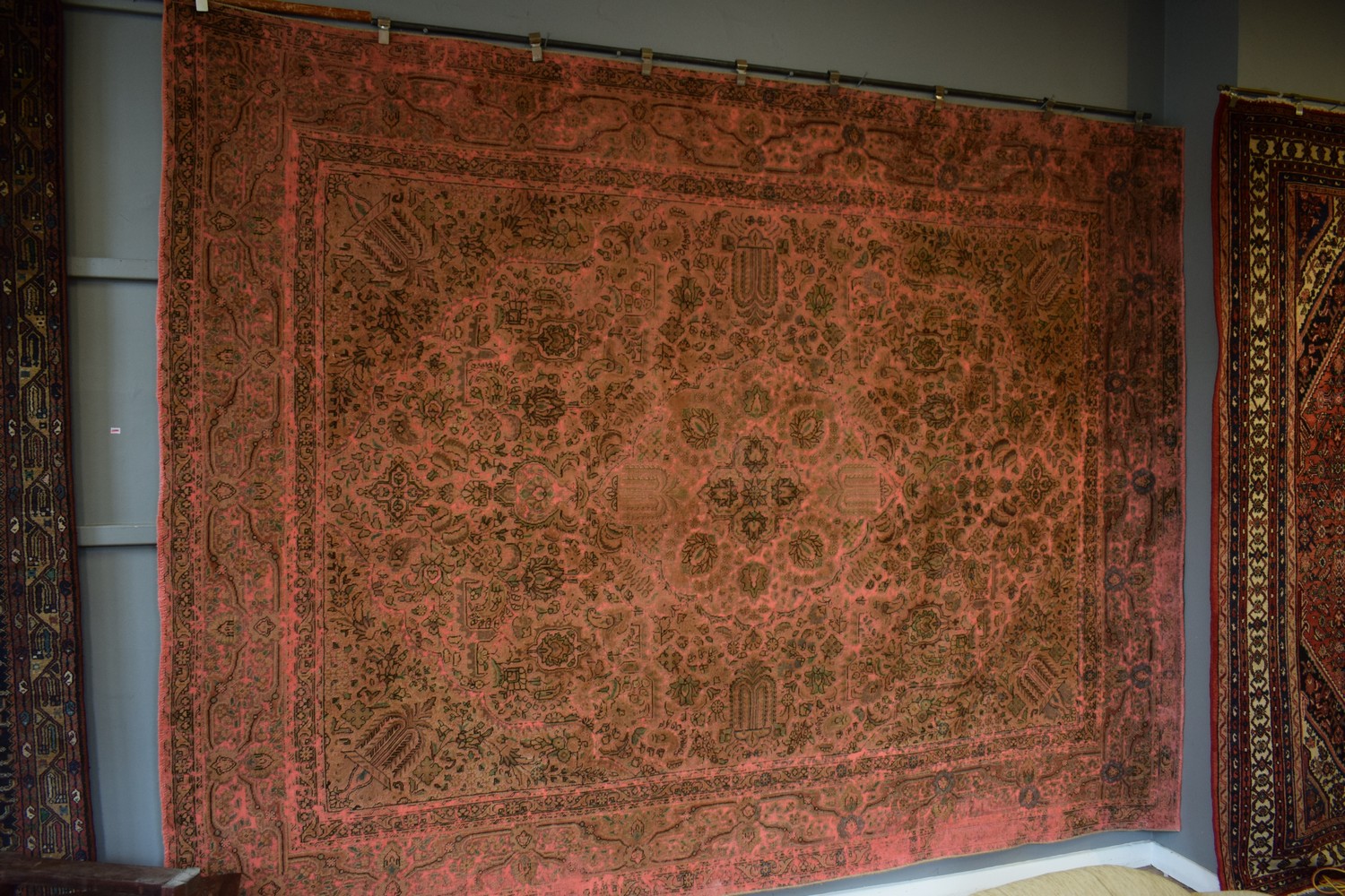 A DECORATIVE MODERN OVER DYED VINTAGE PERSIAN TABRIZ CARPET, VINTAGE PILE, A LARGE UNIQUE CONTEMPORARY CARPET CREATED FROM A VINTAGE HAND KNOTTED PERSIAN TABRIZ CARPET, WITH HAND CARVED AND SHORN PILE TO DISPLAY MEDALLION, CORNER MEDALLION, PALMETTES AND FLORAL MOTIFS OVER DYED IN TONES OF ROSE, BLUE AND TAN, EX-GALLERY DISPLAYED RUG, AS SEEN IN BELLE AND HOME DÉCOR MAGAZINES, SIZE 381 X 292CM, ORIGIN PERSIA, RRP $8,500