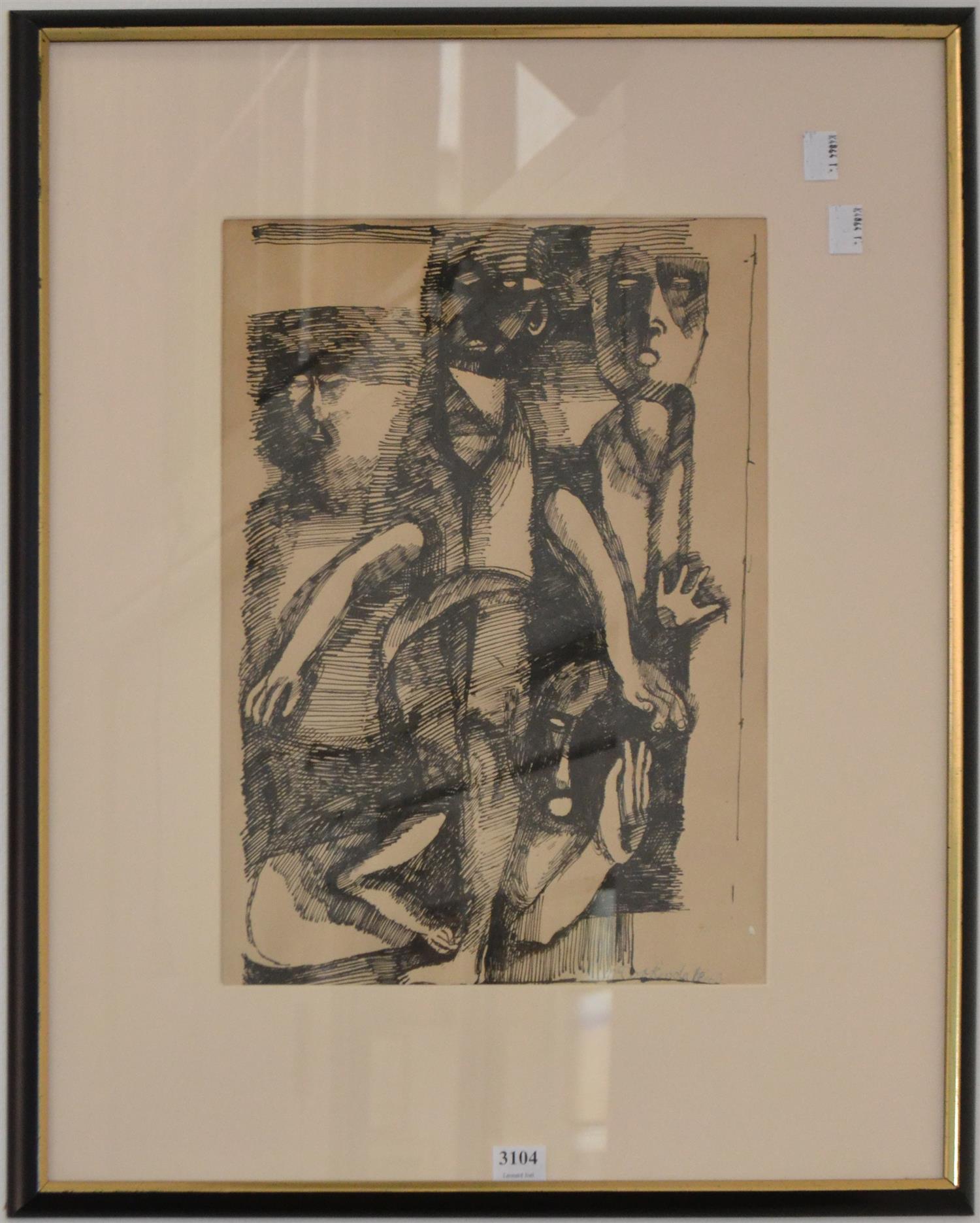 RUTH MCCORKINDA, FIGURAL STUDY, PEN ON PAPER, 36 X 25CM FRAME SIZE: 57 X 45CM, CONDITION: OVERALL DISCOLOURATION