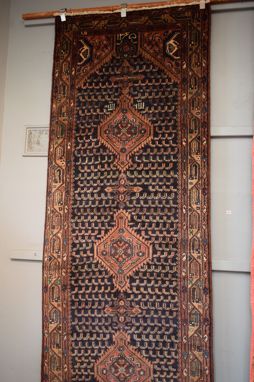 A RARE PERSIAN AVAJ HALL RUNNER, 100% DENSE WOOL PILE IN EXCELLENT CONDITION, WOVEN '1986', VILLAGE WEAVE WITH RARE TRIBAL DESIGN OF REPEATING ANCHORED MEDALLIONS IN A BLUE FIELD OF PAISLEY PATTERNS, SCROLL BORDER, SIZE 320 X 105CM, ORIGIN PERSIA, RRP $2,900