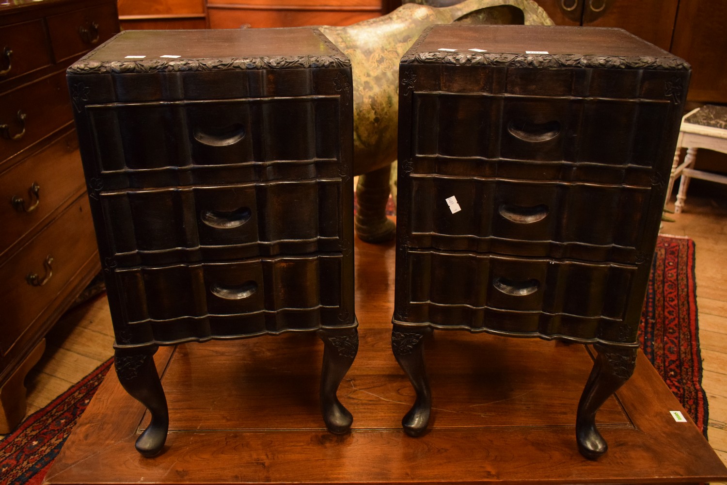 A PAIR OF EBONISED THREE DRAWER BEDSIDES