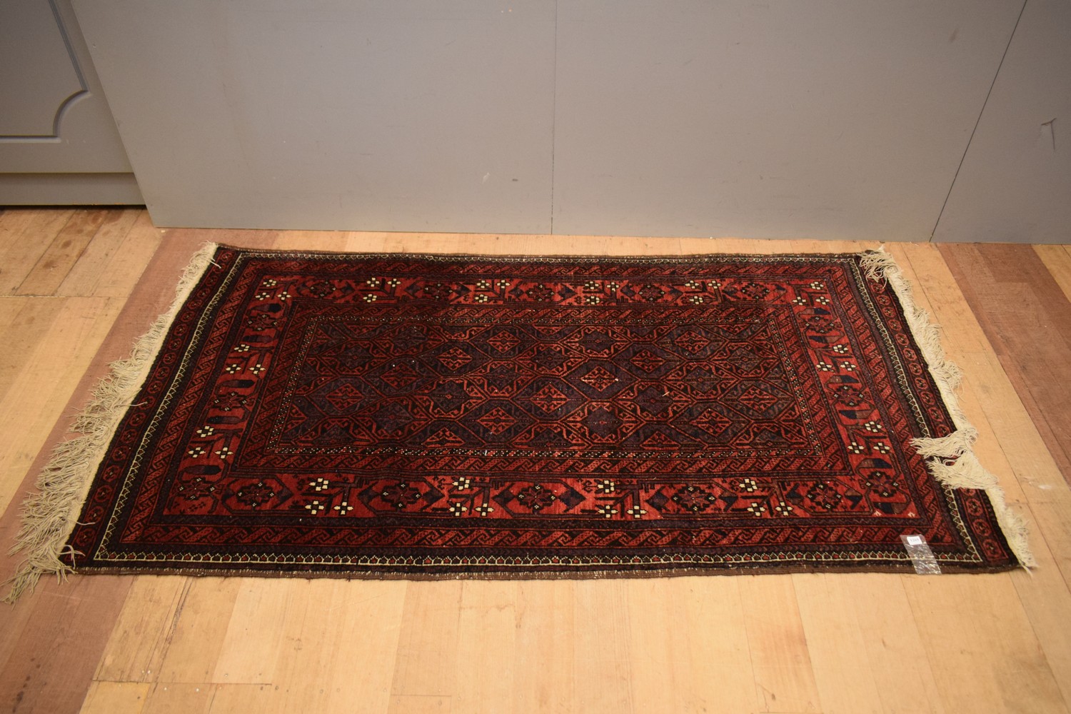 A 100% WOOL HANDMADE RUNNER IN TONES OF RED AND BLUE (210 X 105 CM)