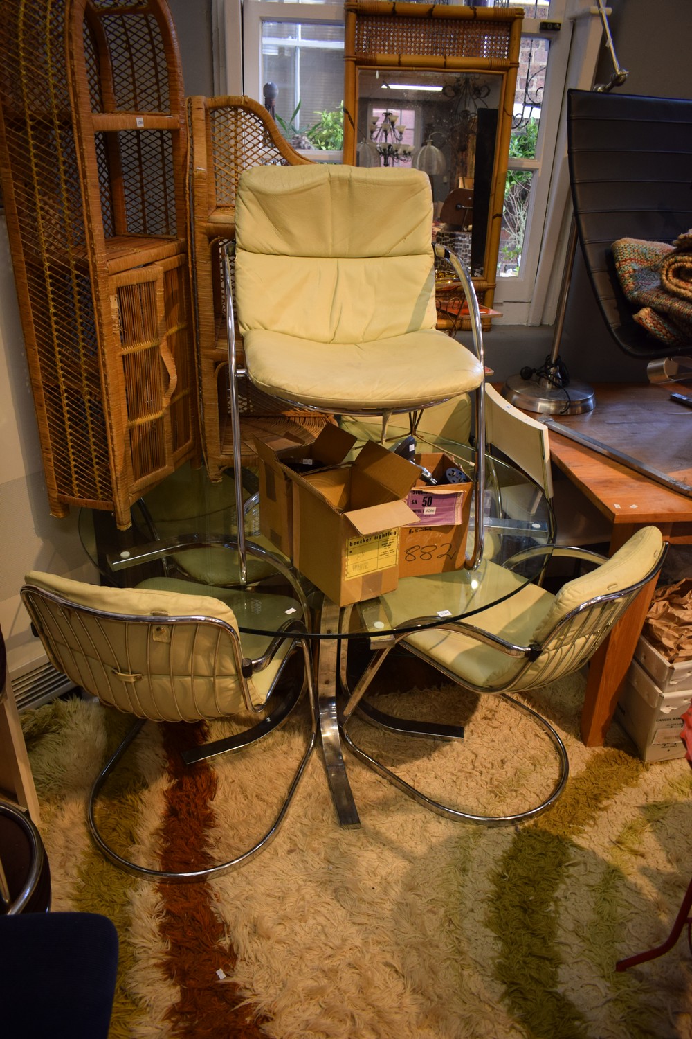 A CONTEMPORARY SIX PIECE CHROME AND LEATHER GLASS TOP DINING SETTING
