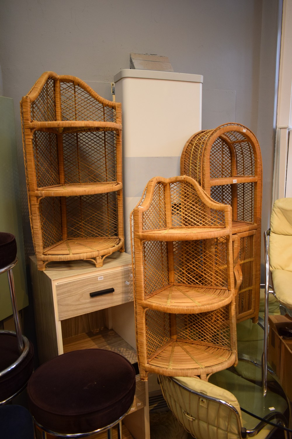A SET OF THREE CANE PIECES, TWO CORNER STANDS AND ONE SMALL CABINET