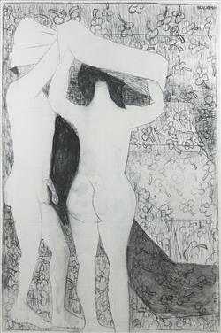 Work bears numerous smudge marks from loose charcoal on the surface. It does appear that the drawing has not been sealed with a fixative upon completion, resulting in the transfer and spreading of charcoal. One small (pin-head sized) blue dot of foreign paint is present on the top right hand edge on canvas.