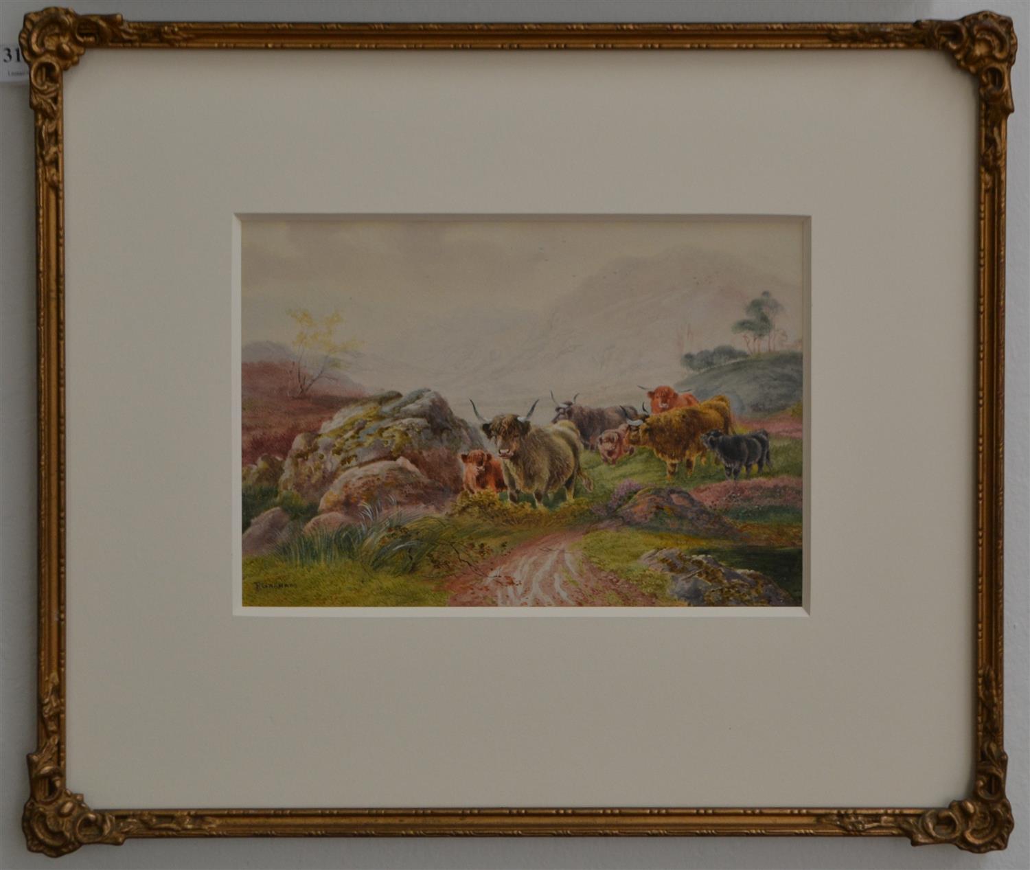 PETER GRAHAM, HIGHLAND COWS, WATERCOLOUR, IMAGE SIZE: 17 X 24CM, FRAME SIZE: 37 X 43CM, CONDITION: VERY GOOD, NO GLASS IN FRAME
