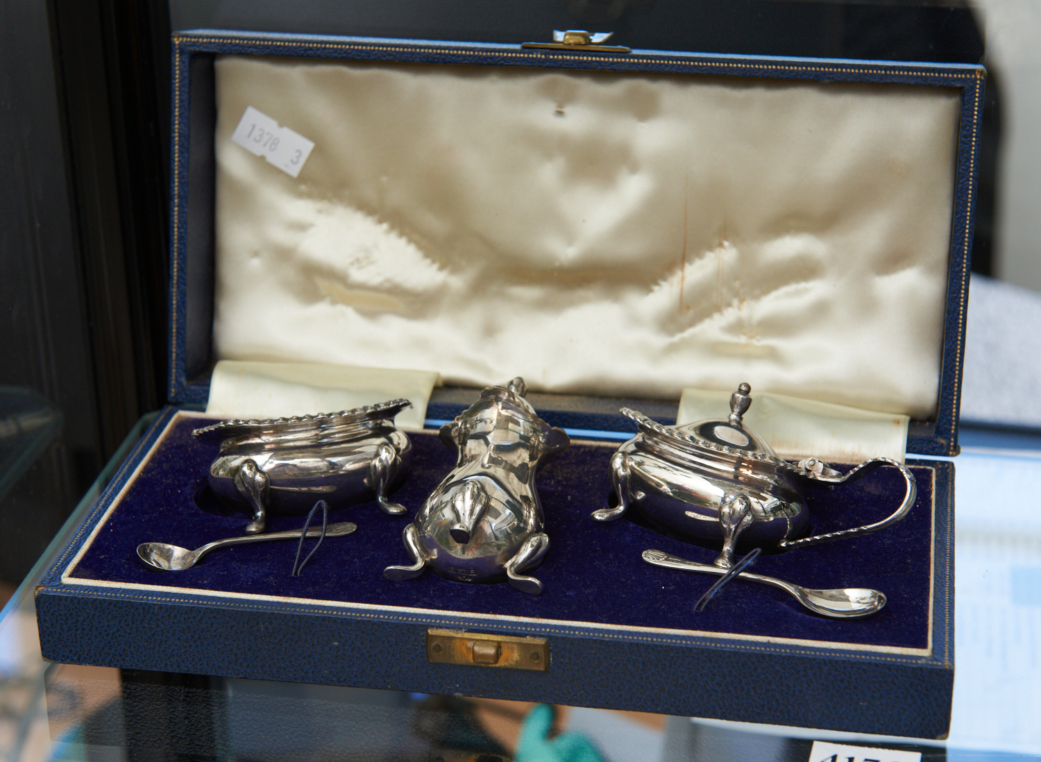 A STERLING SILVER CASED CRUET SET WITH GADROONED RIM