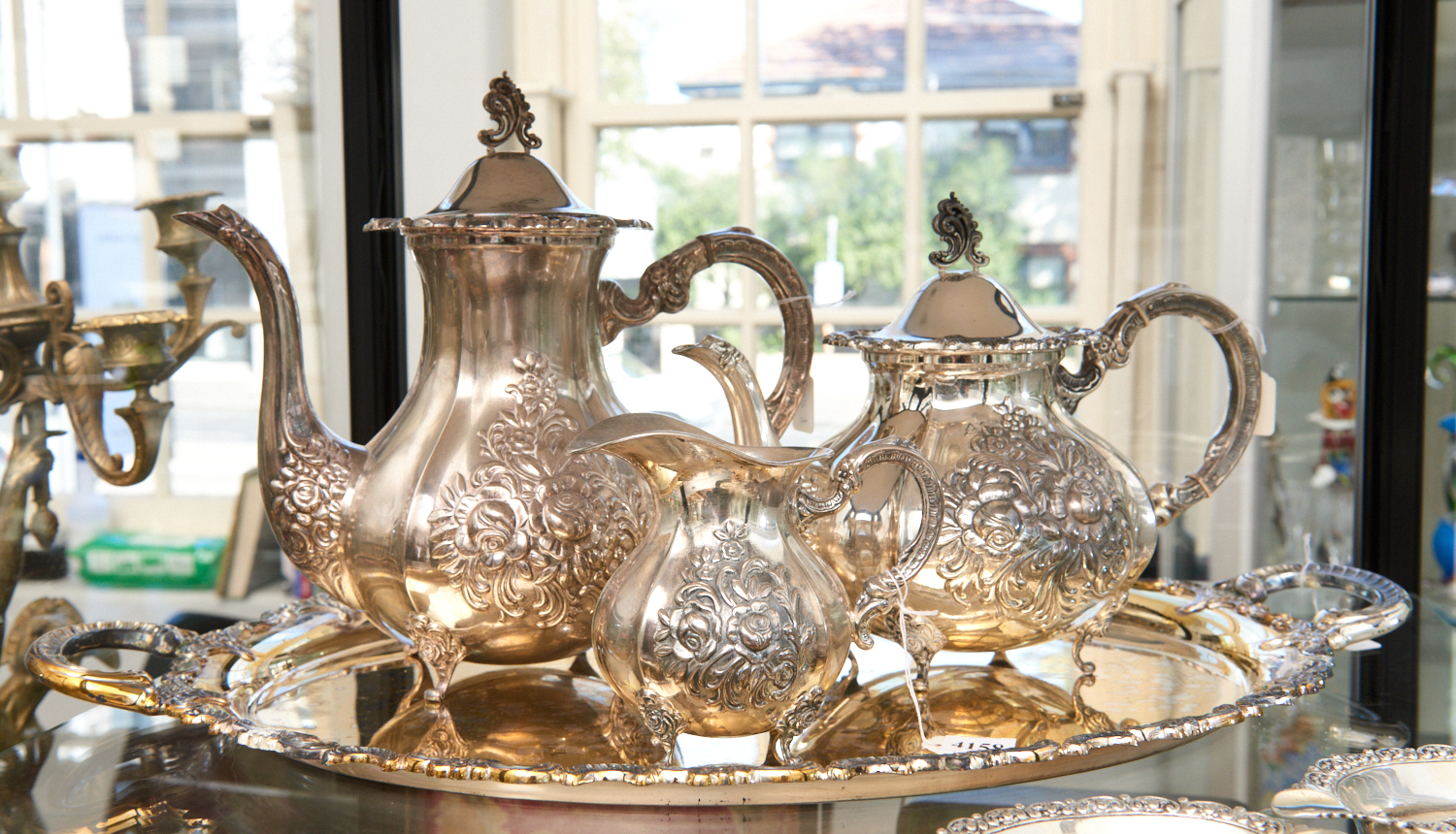 A STERLING SILVER THREE PIECE TEA AND COFFEE SERVICE ON MATCHING STERLING SILVER OVAL TWO HANDLED TRAY