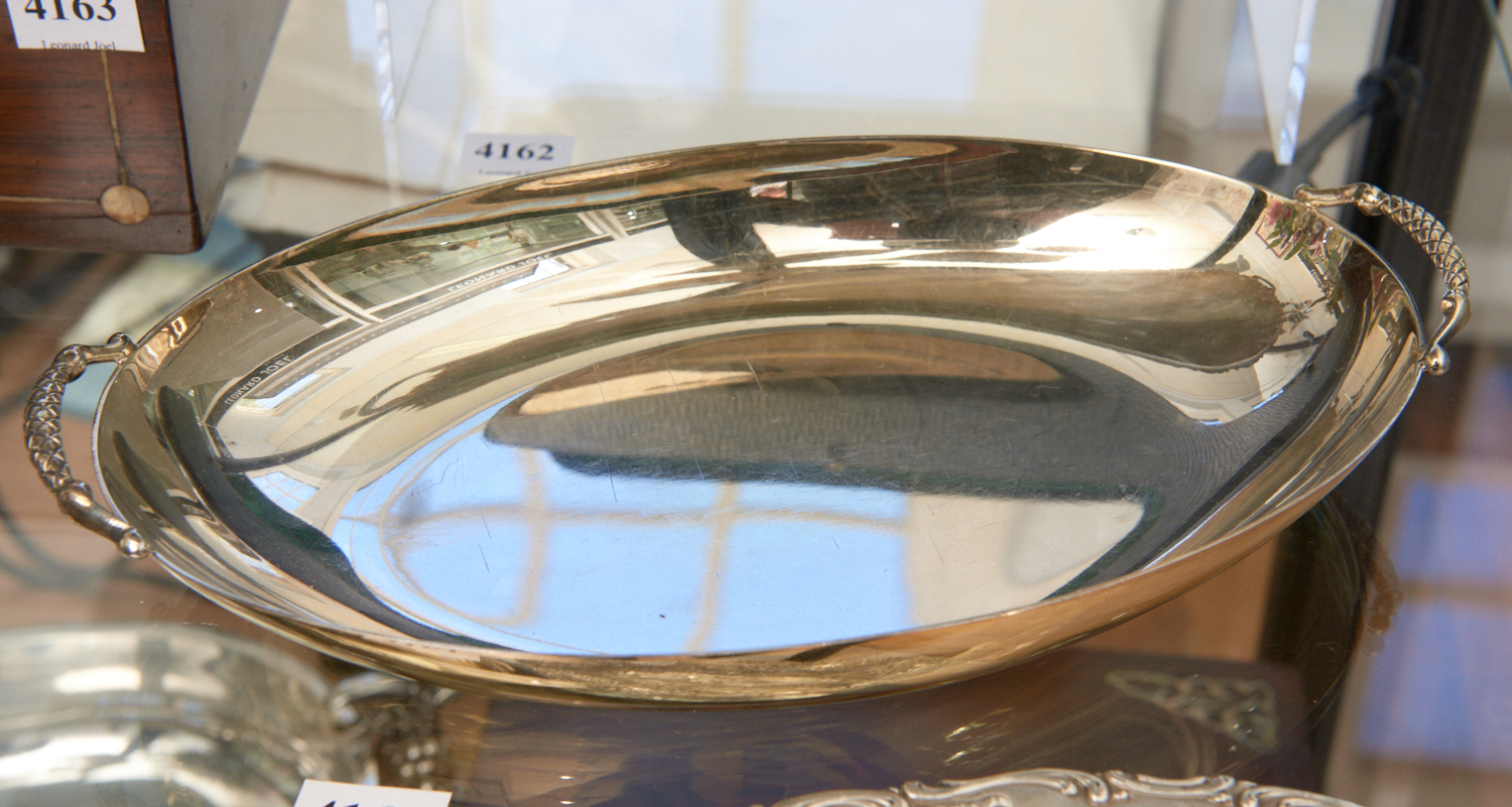 A STERLING SILVER OVAL DISH PLAIN WITH CROSSHATCH HANDLES, WIDTH 26CM