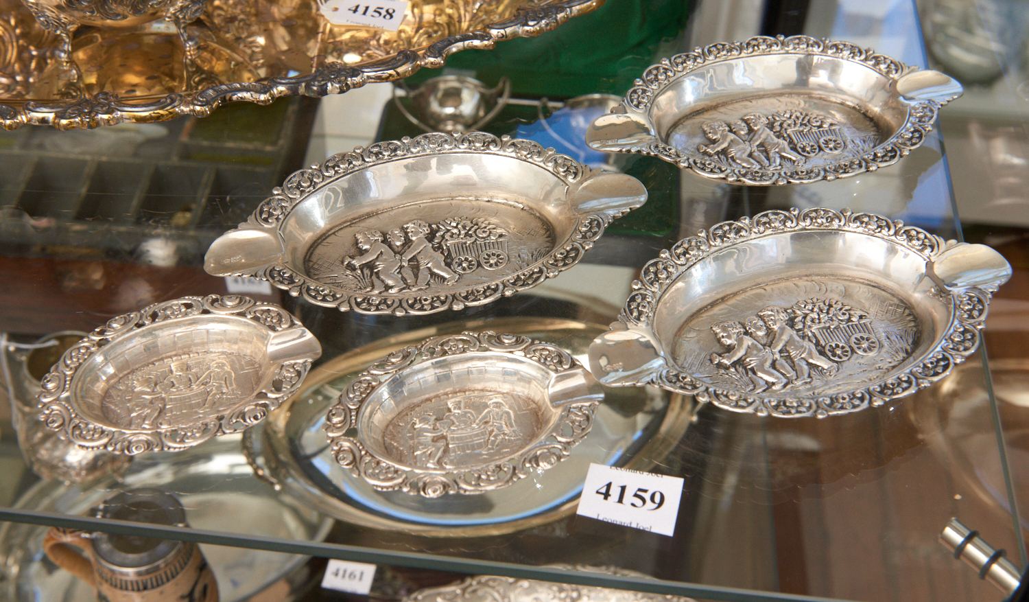 FIVE GERMAN 800 SILVER ORNATE EMBOSSED ASHTRAYS (THREE LARGE AND TWO SMALL)