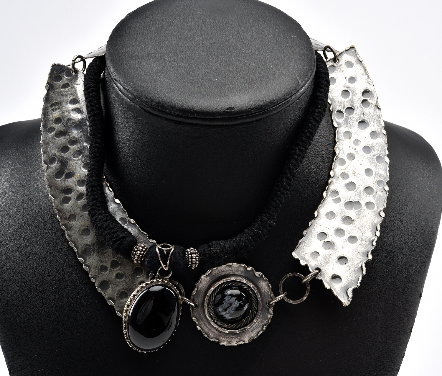 TWO ONYX SET NECKLACES, ONE IN SILVER AND ONE ON BLACK CORD
