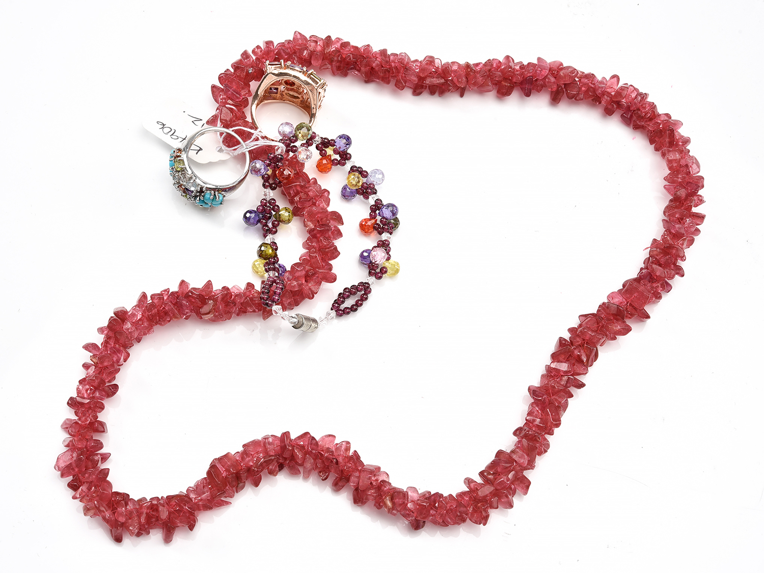 A COLLECTION OF JEWELLERY INCLUDING STONE SET DRESS RINGS (ONE A/F), A TUMBLED GLASS BEAD NECKLACE AND A GARNET AND BRIOLETTE CUT MULTI-GEM SET BRACELET.