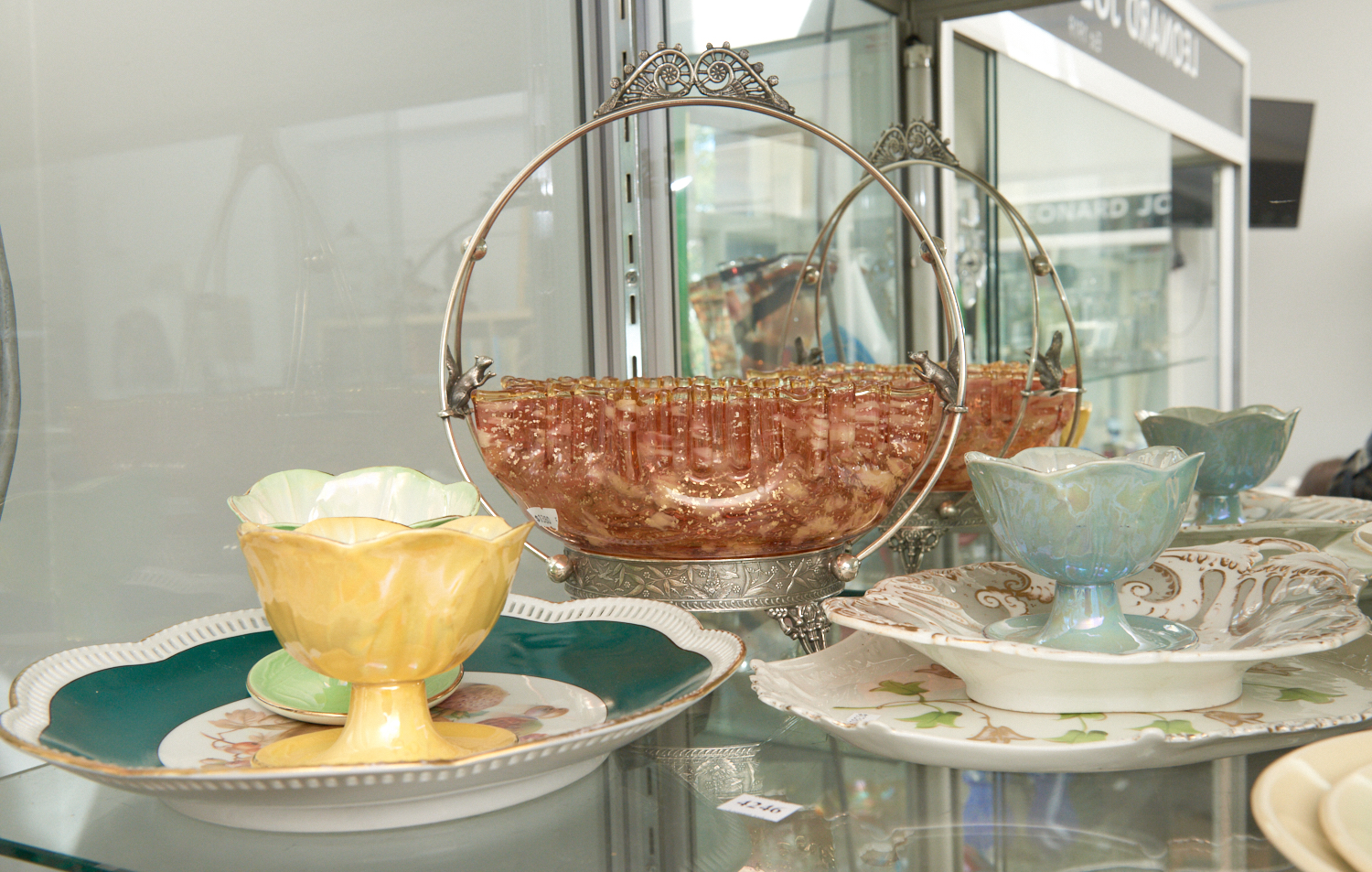 AN AMERICAN MOTTLED GLASS AND EPNS BOWL, AND ASSORTED CHINA INCLUDING MAILING WARE