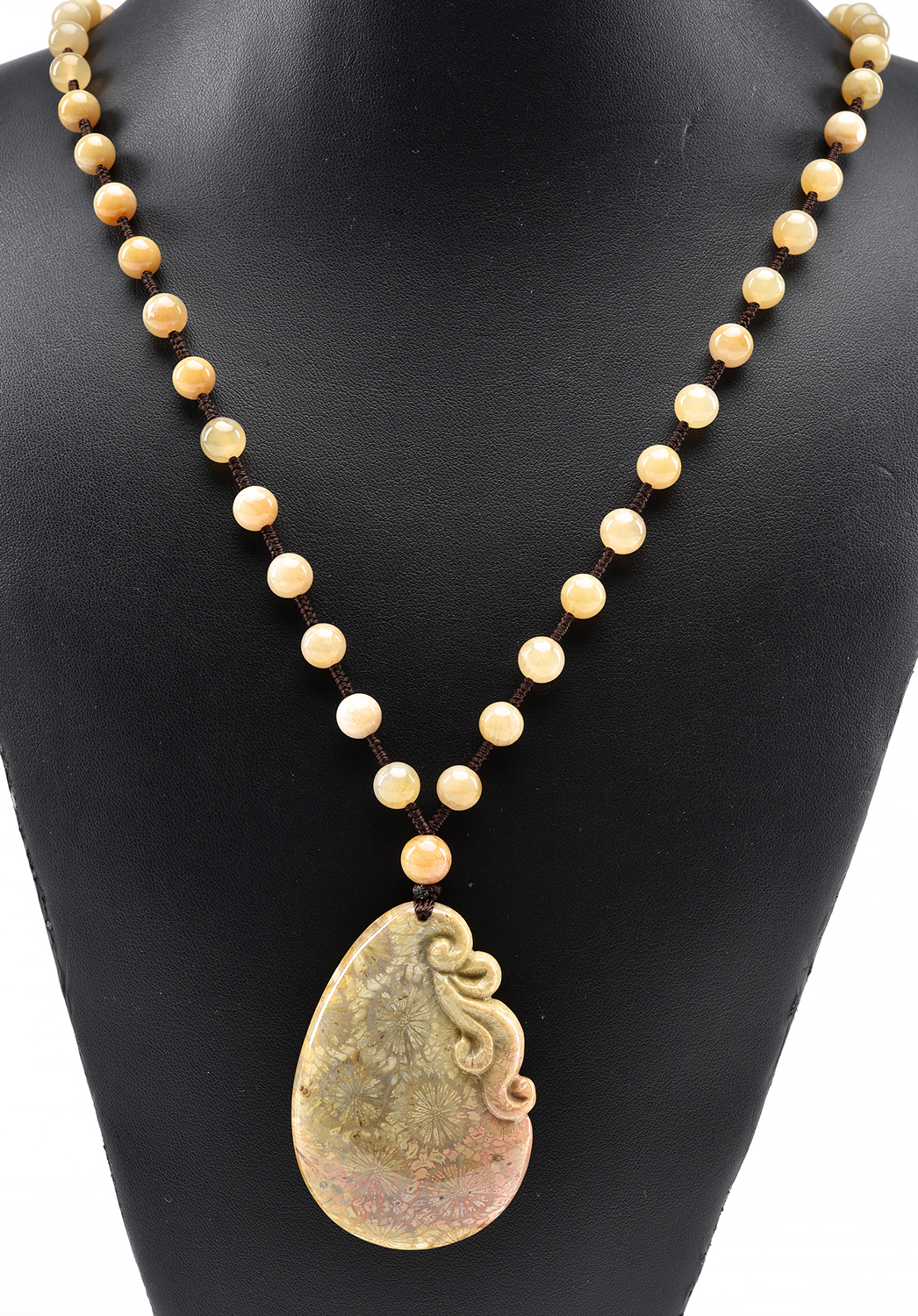 AN INDONESIAN CRYSTAL STONE PENDANT NECKLACE - KNOWN AS CORAL JADE