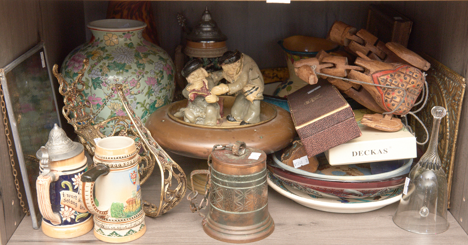 A LARGE GROUP OF CERAMICS, METAL WARE, ELEPHANT PUPPET, BOXED FLUTE ETC, AND STILL LIFE FRAMED
