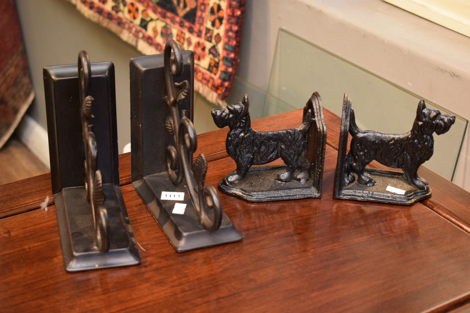 TWO PAIRS OF METAL BOOKENDS, FEATURING DOGS AND LEAVES