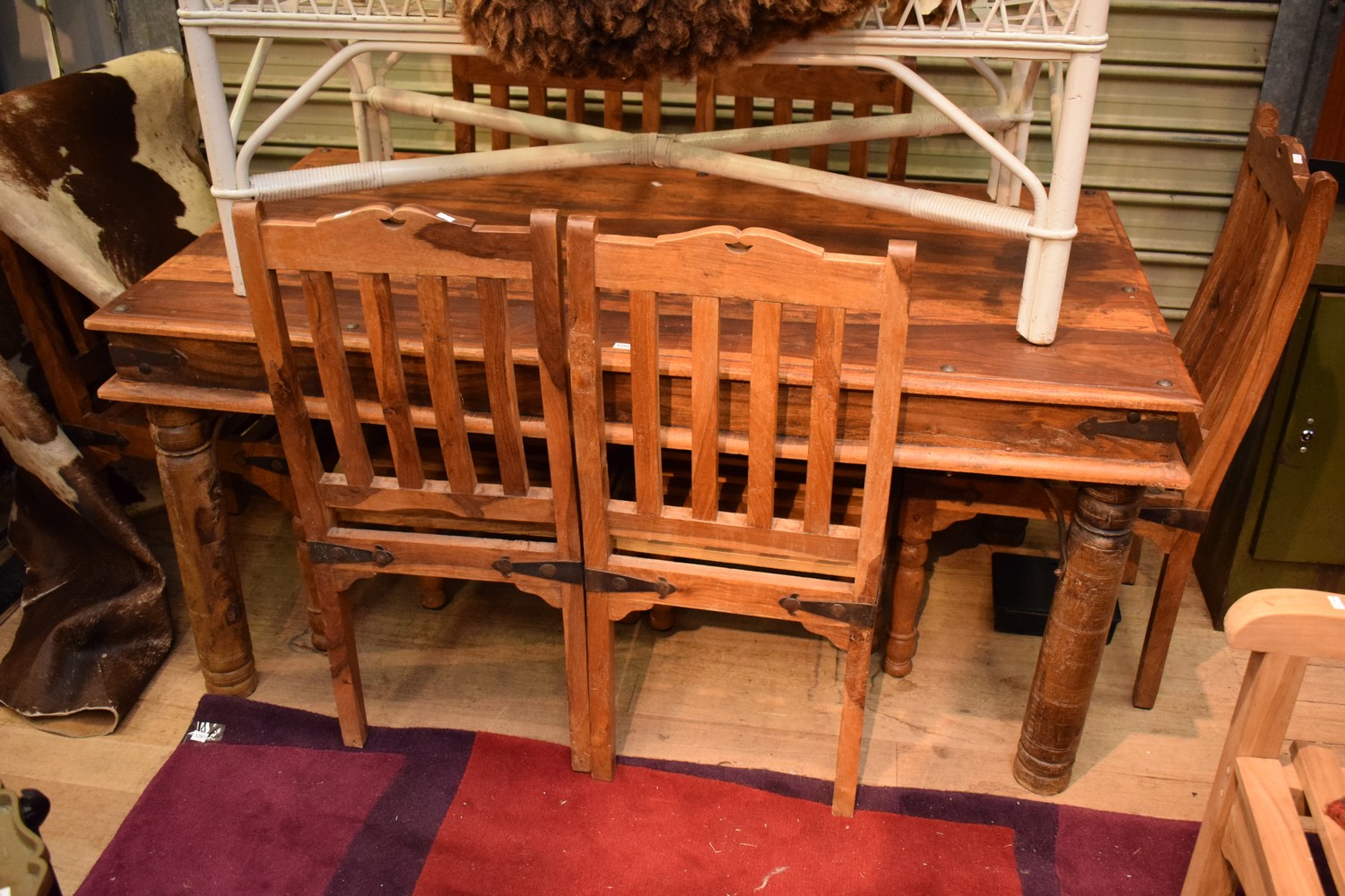 A RUSTIC TIMBER SEVEN PIECE DINING SETTING WITH METAL DETAILING (76H x 160W x 90D CM)