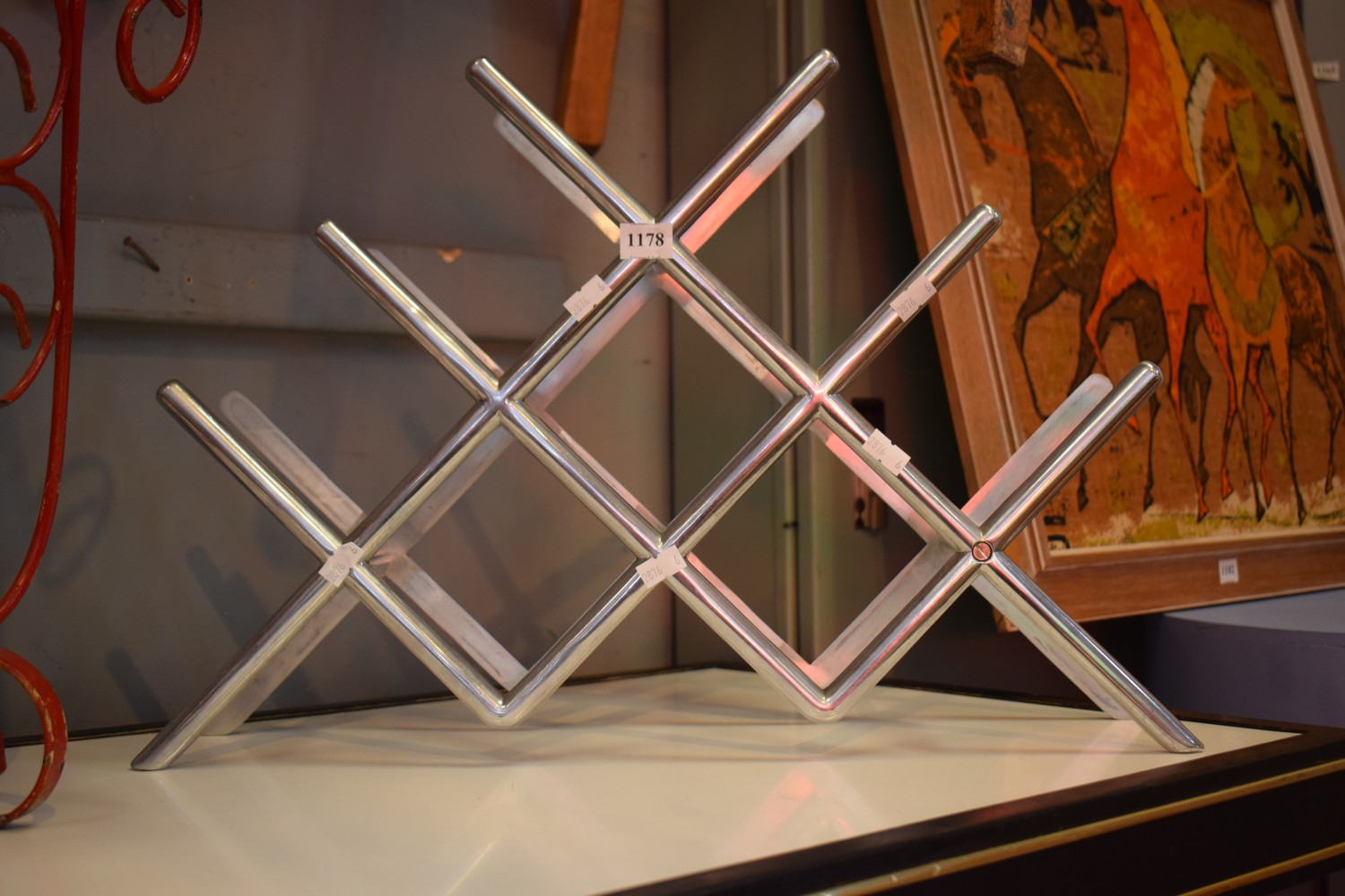 A BRUSH METAL NINE BOTTLE WINE RACK