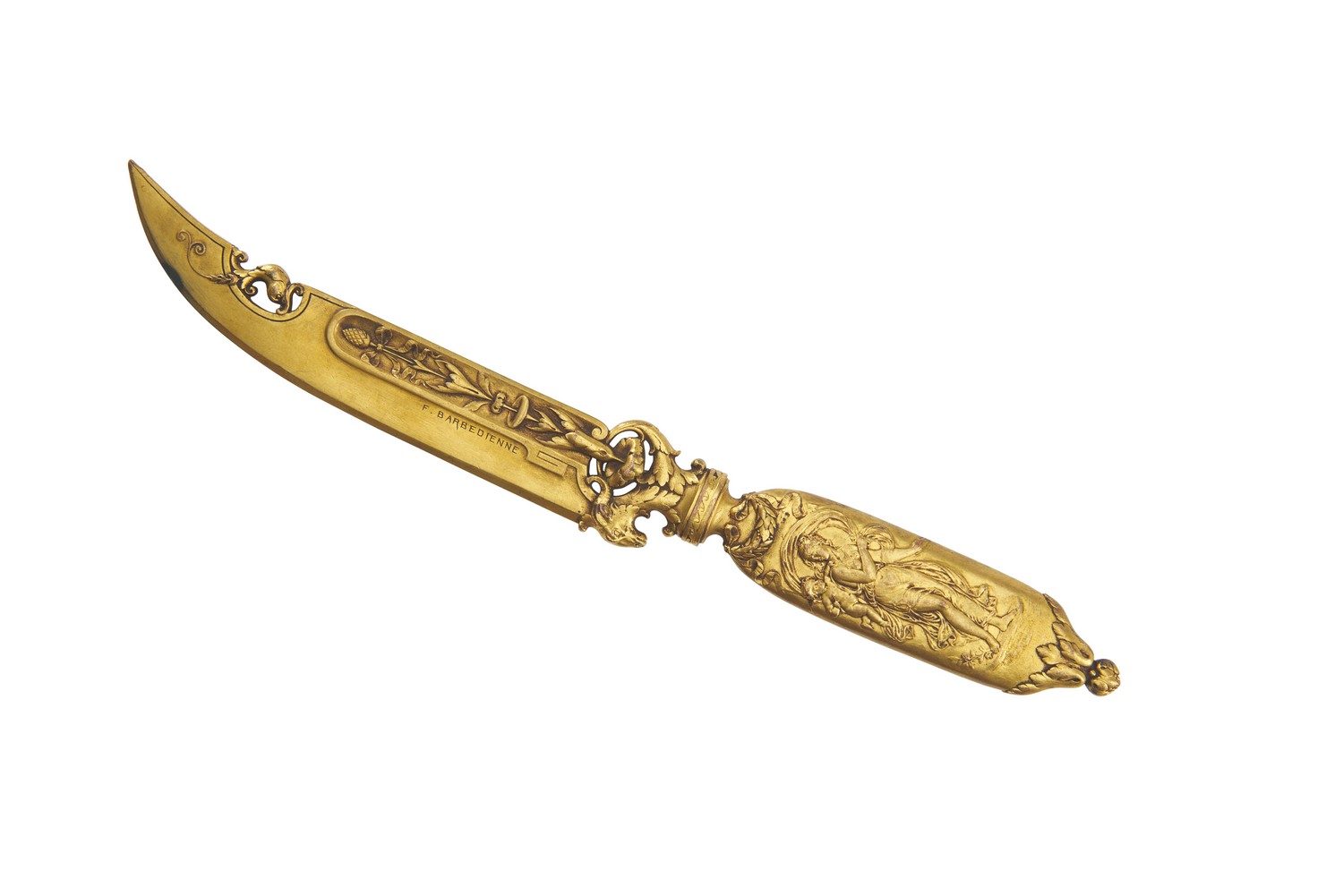 Modelled in the Renaissance style with laurel motifs and a scene of Venus and Cupid to the handle. Signed F. Barbedienne, and L. Sévin inv. 1873 (designer).