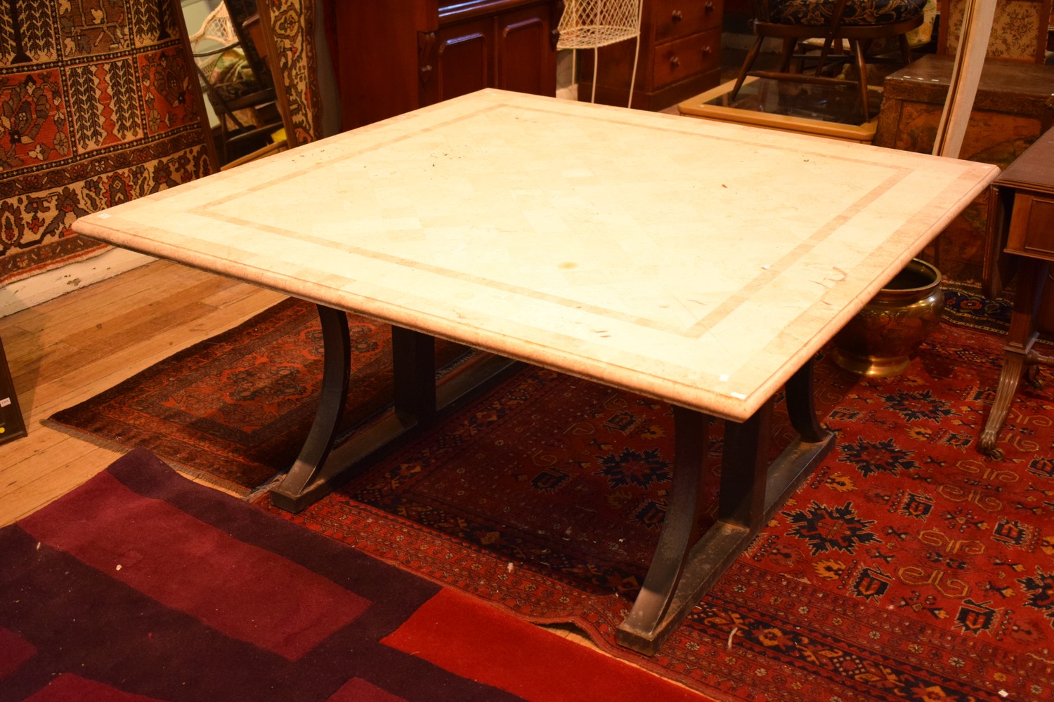 A LARGE COMPOSITE TOPPED AND IRON BASED OUTDOOR TABLE (74H x 151W x 151D CM) (PLEASE NOTE THIS ITEM MUST BE REMOVED BY CLIENTS OR CARRIERS AT THE CUSTOMERS EXPENSE)