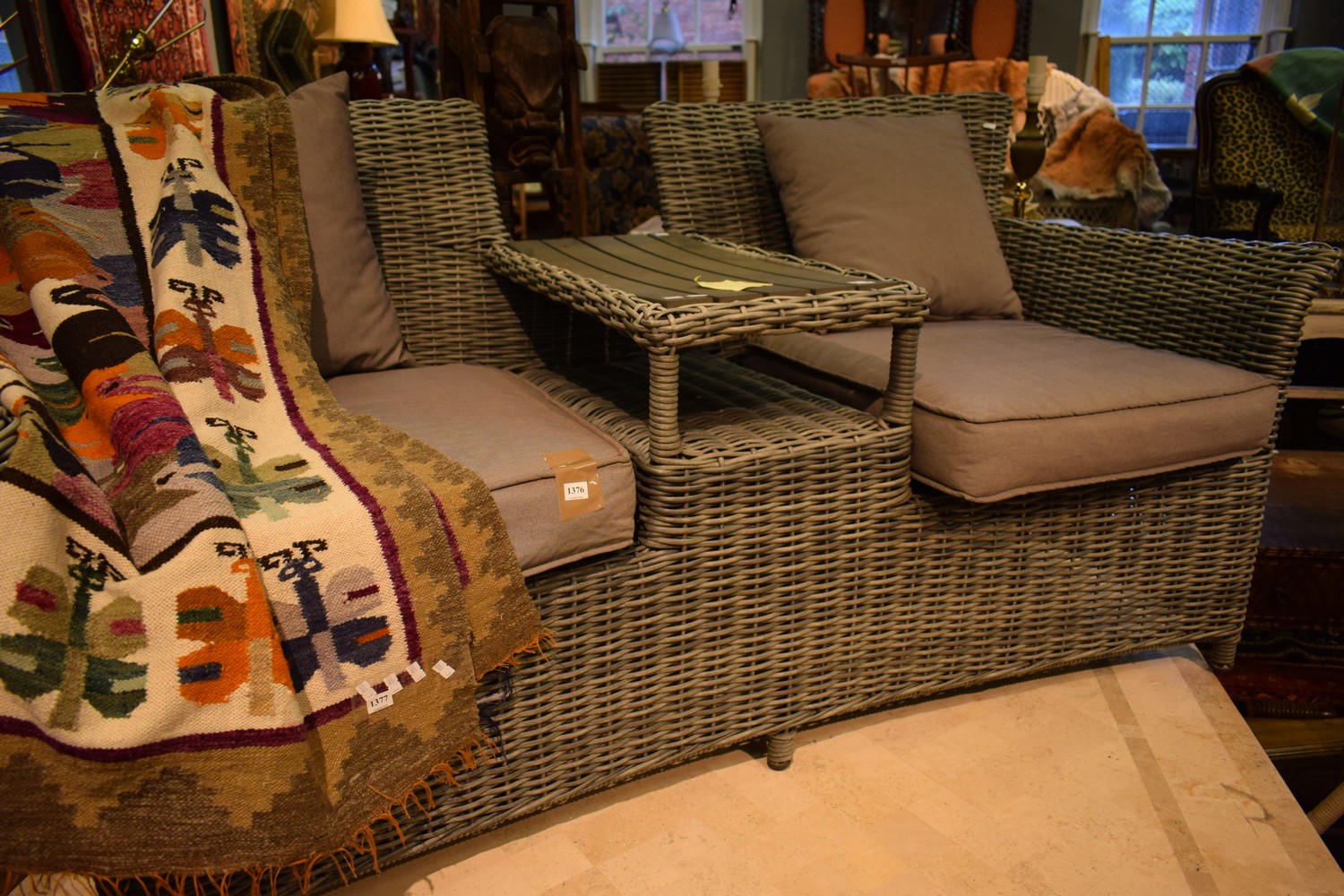 AN OUTDOOR TWO SEATER LOUNGE AND TABLE PIECE (A/F)
