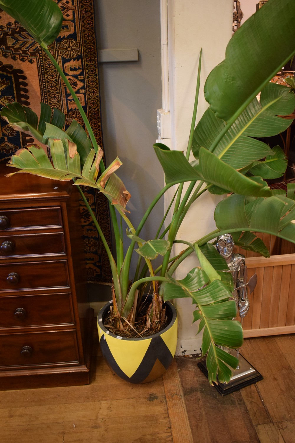 A SUBSTANTIAL INDOOR PLANT IN A PAINTED POT (STRELITZIA NICOLA)