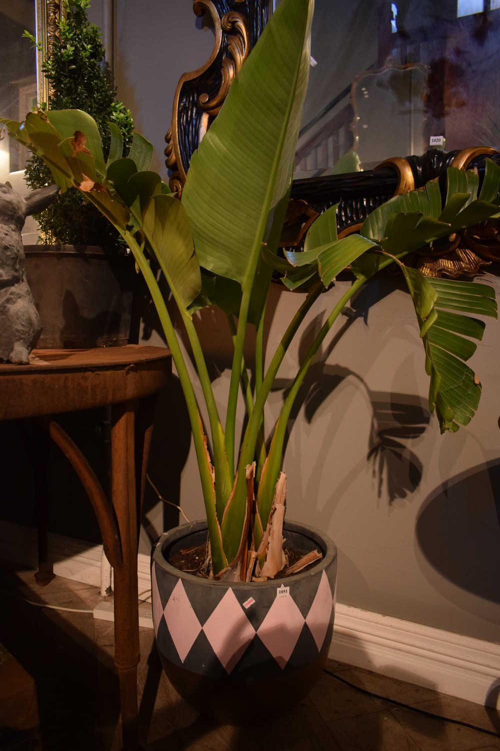 A SUBSTANTIAL INDOOR PLANT IN A PAINTED POT (STRELITZIA NICOLA)