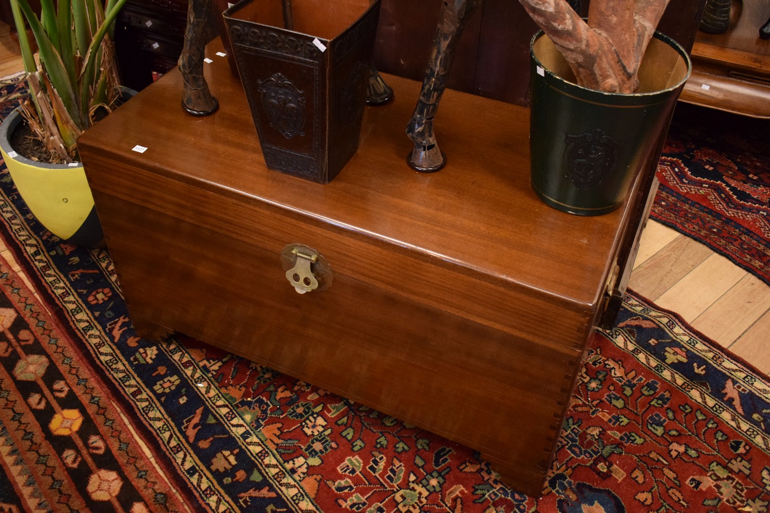 A LARGE TIMBER TRUNK WITH BRASS HANDLES (59H x 104W x 52D CM)