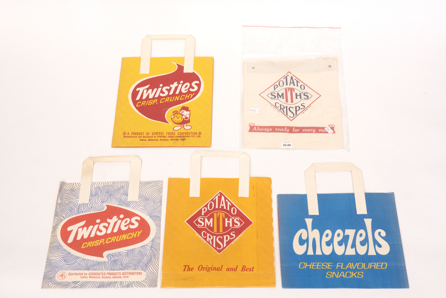 FIVE VINTAGE SHOW BAGS INCLUDING SMITHS POTATO CHIPS, TWISTIES, CHEEZELS