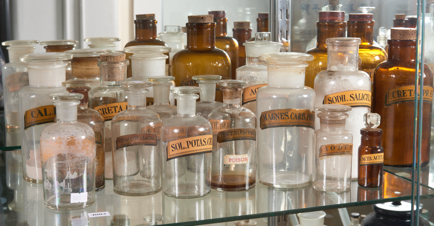 A COLLECTION OF TWENTY VINTAGE CLEAR AND COLOURED GLASS APOTHECARY BOTTLES WITH PRINTED PAPER LABELS, VARIOUS SIZES AND DESIGNS