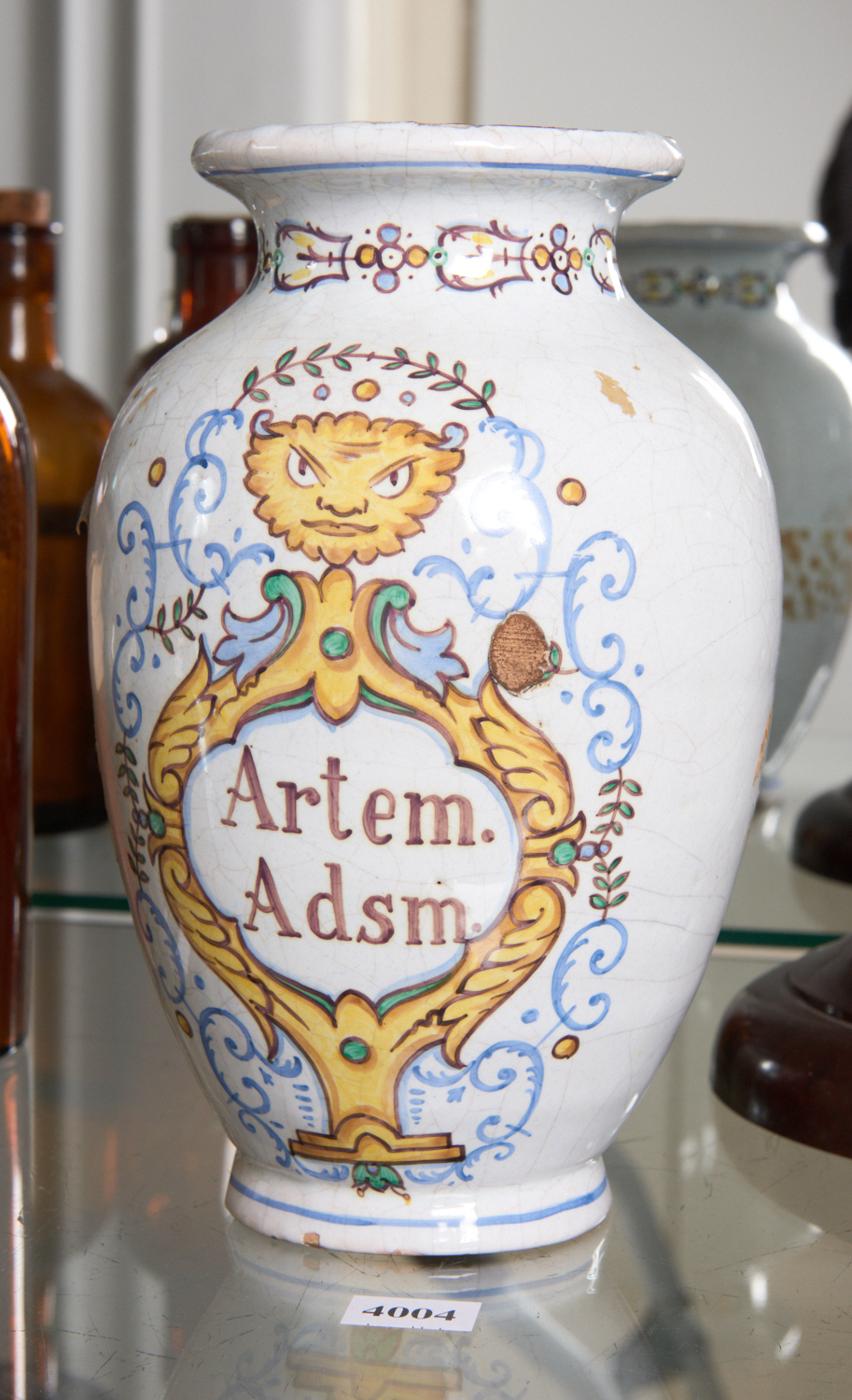 A SALT GLAZED MAJOLICA DRUG JAR, POSSIBLY ITALIAN (SOME LOSSES)