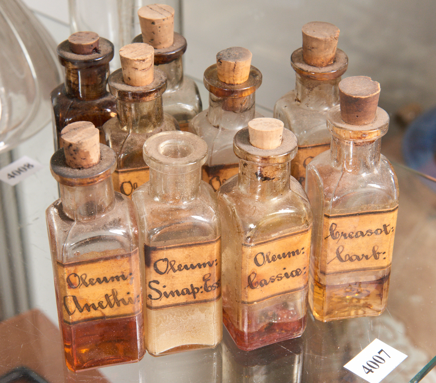 A COLLECTION OF NINE VINTAGE CLEAR GLASS APOTHECARY BOTTLES WITH HANDWRITTEN LABELS, VARIOUS SIZES AND DESIGNS