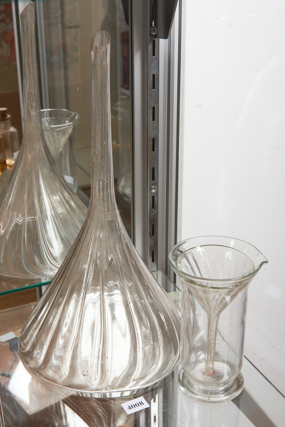 A GROUP OF CLEAR GLASS CHEMIST MEASURES INCLUDING TWO FUNNELS AND A BEAKER