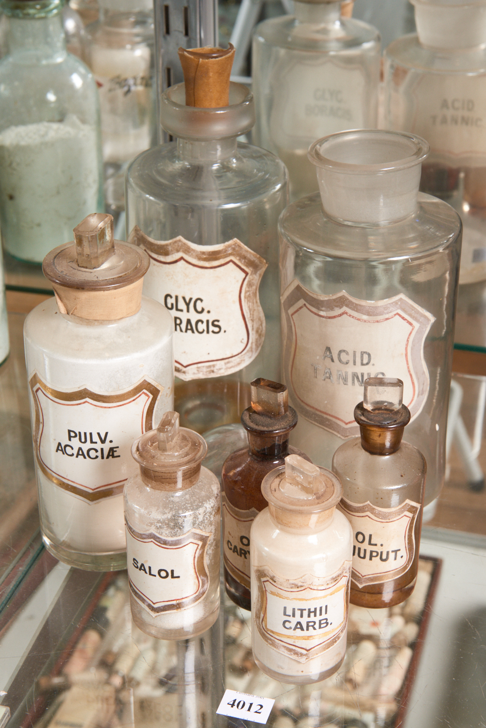 A COLLECTION OF SEVEN VINTAGE CLEAR AND COLOURED GLASS APOTHECARY BOTTLES WITH PAPER LABELS, VARIOUS SIZES AND DESIGNS