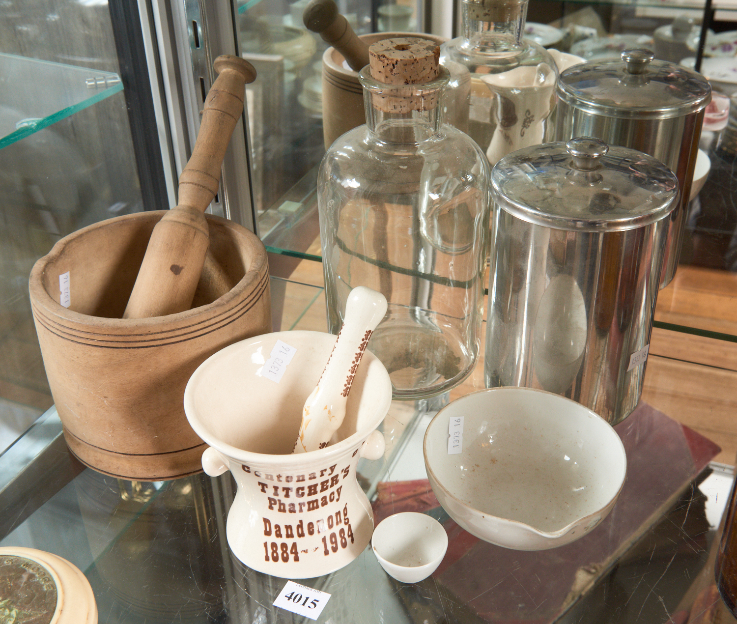 A COLLECTION OF PHARMACY RELATED ITEMS INCLUDING TWO MORTAR AND PESTLES, TWO CERAMIC MIXING BOWLS, A CLEAR GLASS BOTTLE AND A METAL CANNISTER