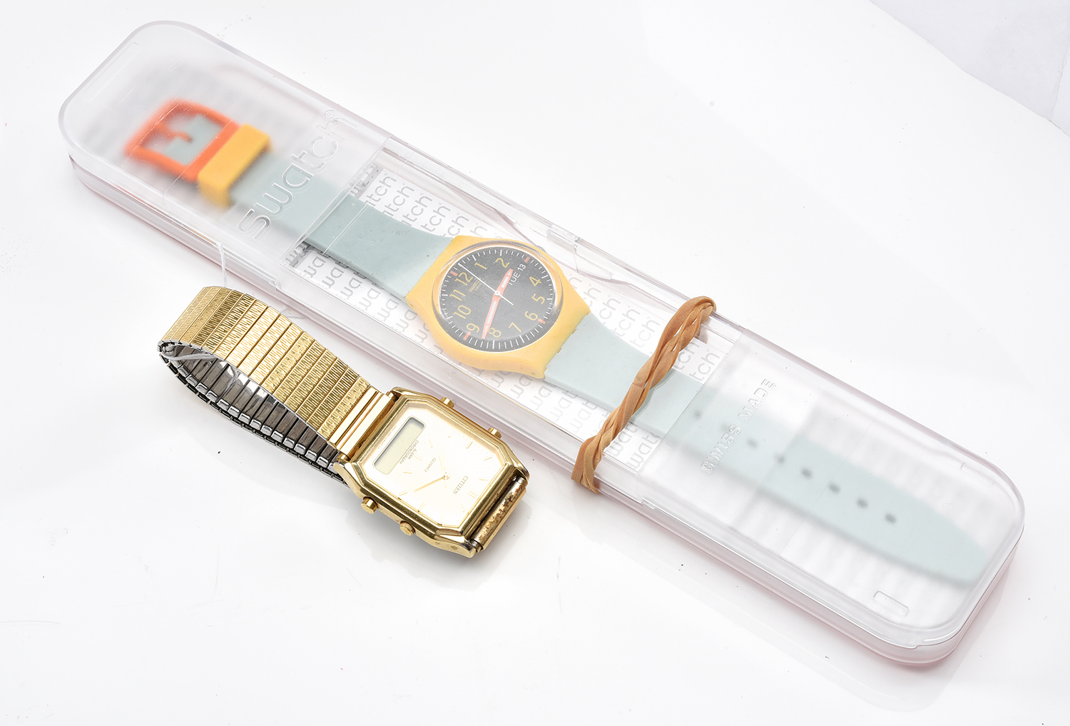 A SWATCH WRISTWATCH, BOXED, TOGETHER WITH A CITIZEN WRISTWATCH, (A/F)