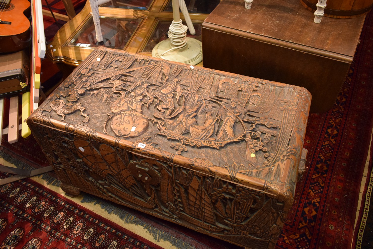 A HEAVILY CARVED CAMPHORWOOD CHEST