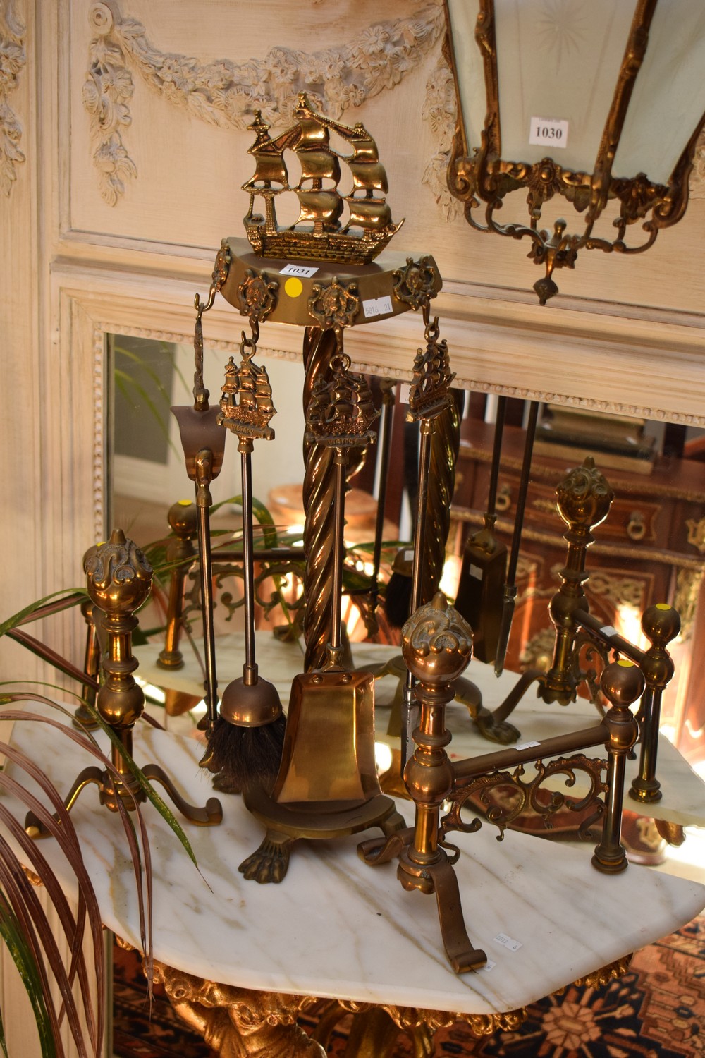 A SET OF FIRE TOOLS AND A PAIR OF FIRE DOGS