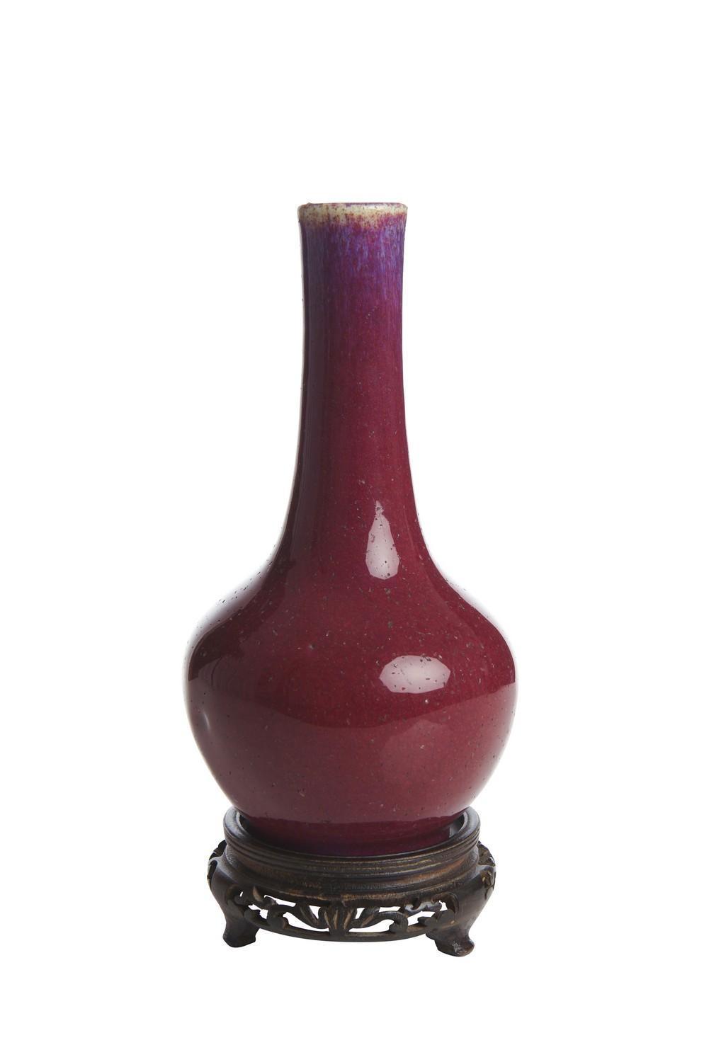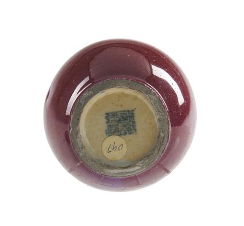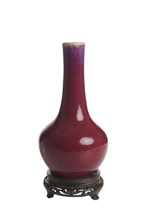 Covered in a rich copper red glaze with flambe effect, together with a wooden stand. Four character Qianlong mark to base.