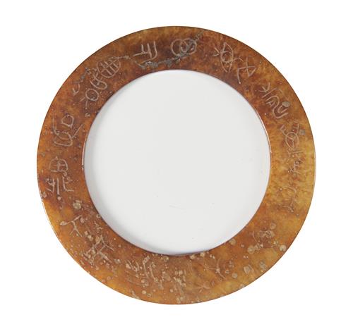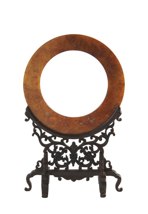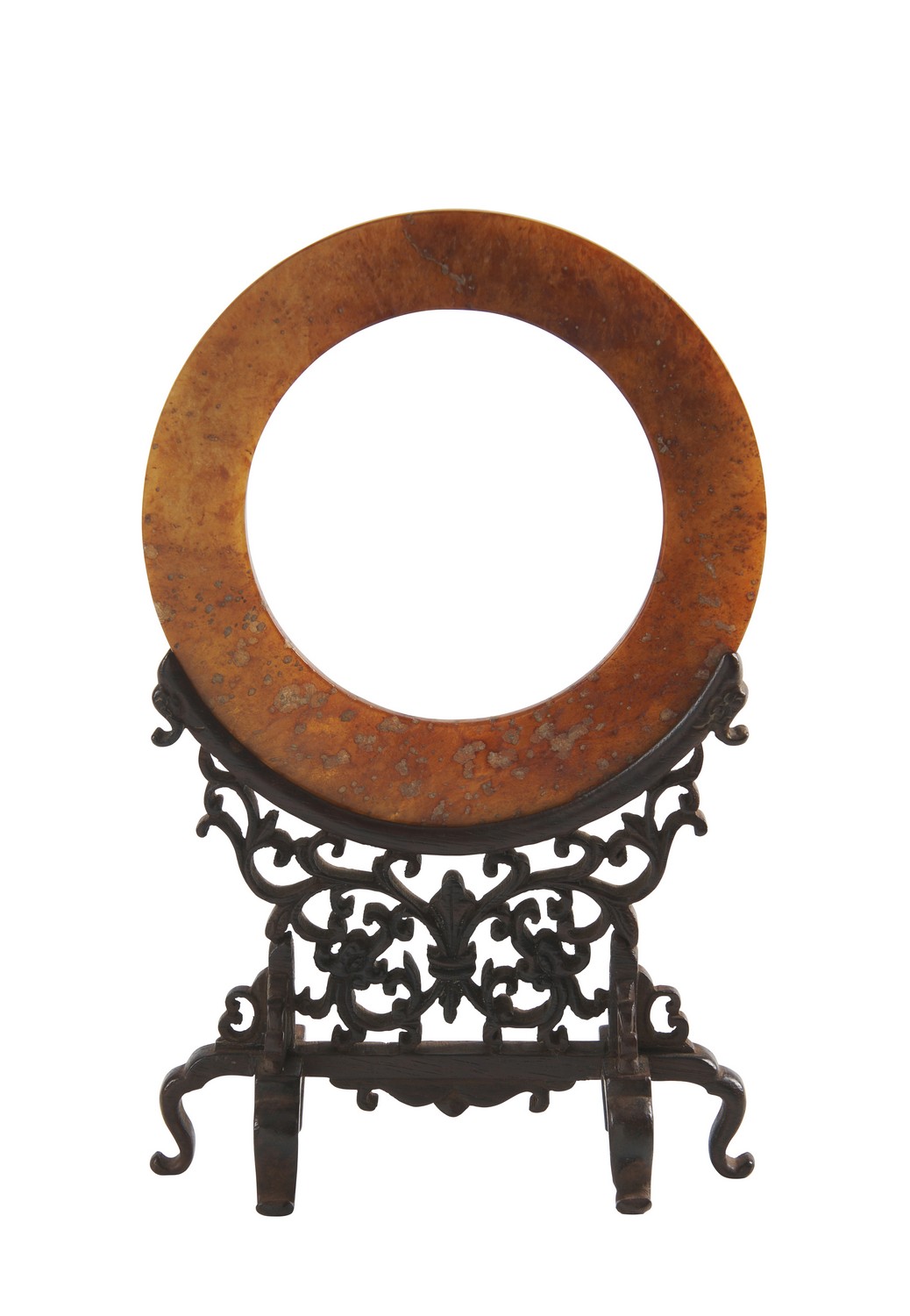 A CHINESE INSCRIBED BROWN JADE BI AND STAND