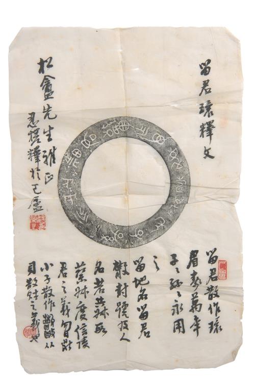 The jade of orange-brown hue, inscribed to one side in seal script, on a fitted hardwood stand. Together with an inscribed Republic Period paper rubbing of the bi.