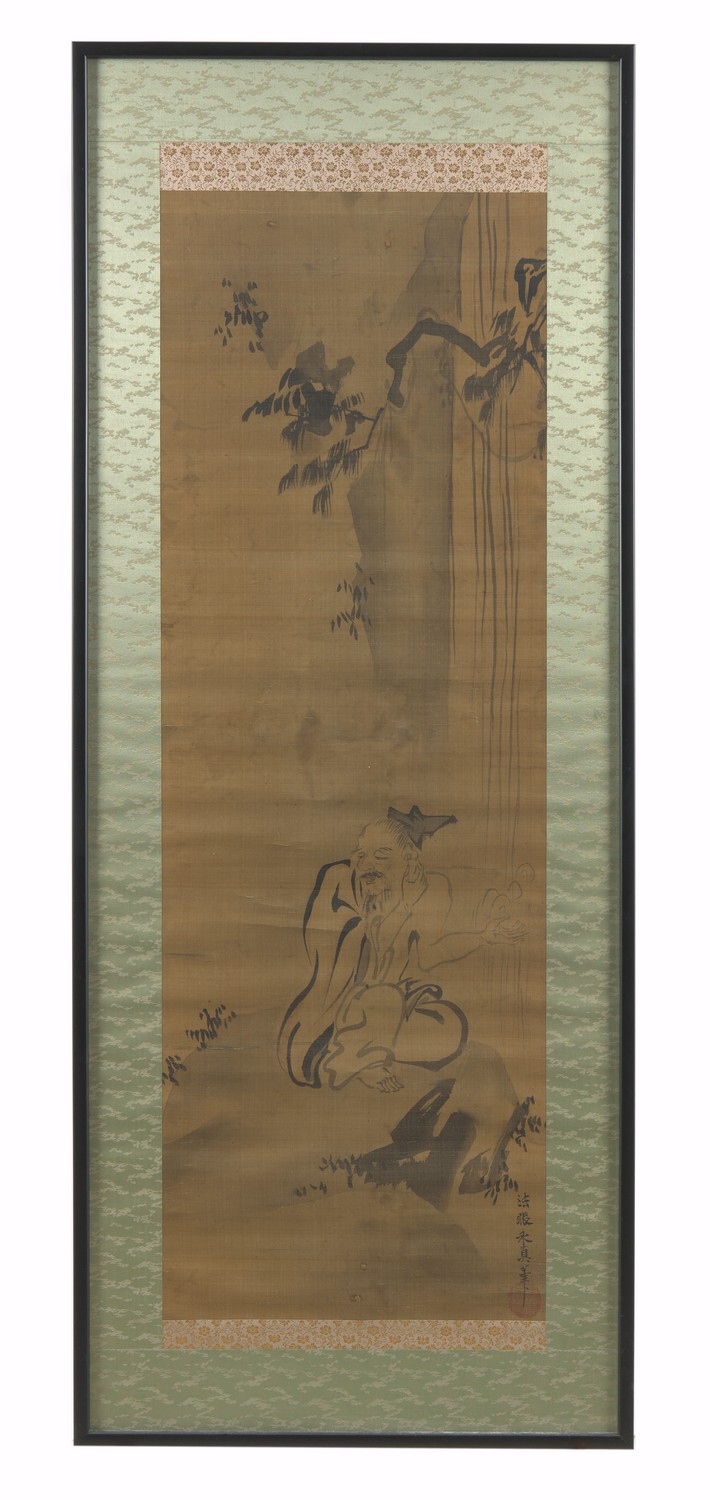 Ink painting of a sage sitting on a rocky outcrop. Signed 'Hogen Eishin Hitsu' with a red circular seal. Mounted later on quality silk brocade.