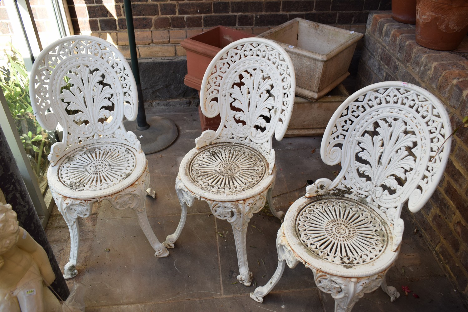 A SET OF THREE WHITE CAST IRON OUTDOOR CHAIRS