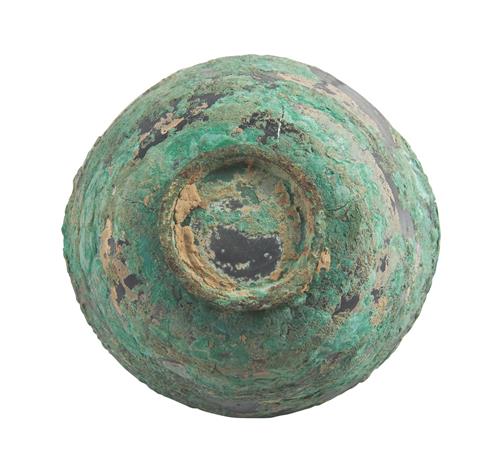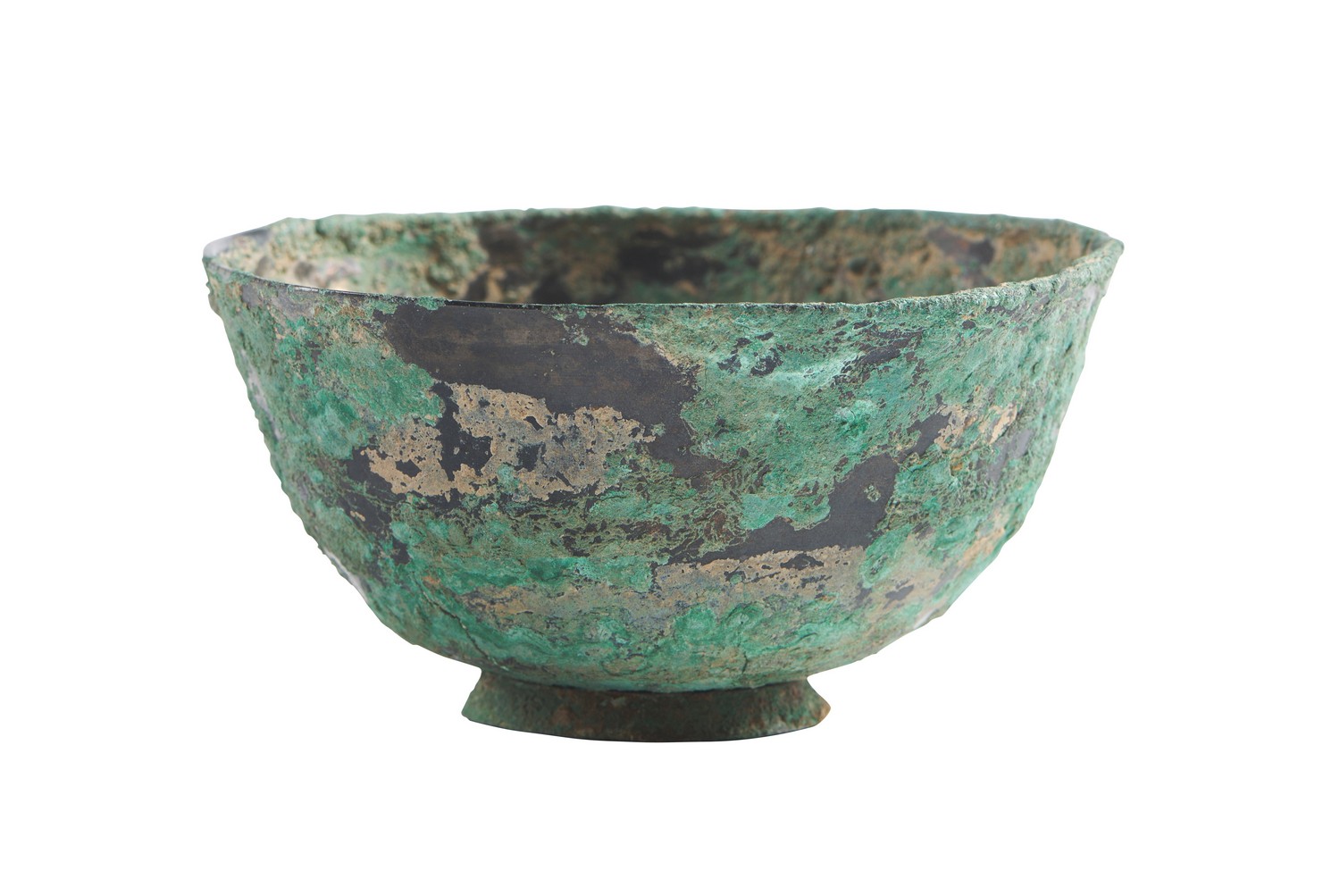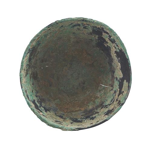 The deep bowl covered to parts in deep verdigris encrustation, together with a fitted Chinese box.