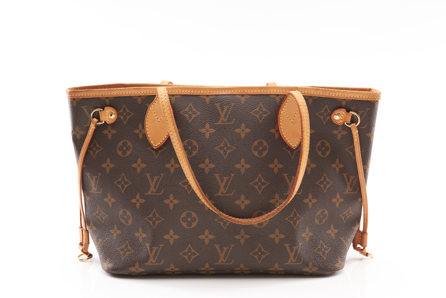 Styled in monogram canvas with tan leather trim and gold metal hardware, 22 x 29 x 13cm.