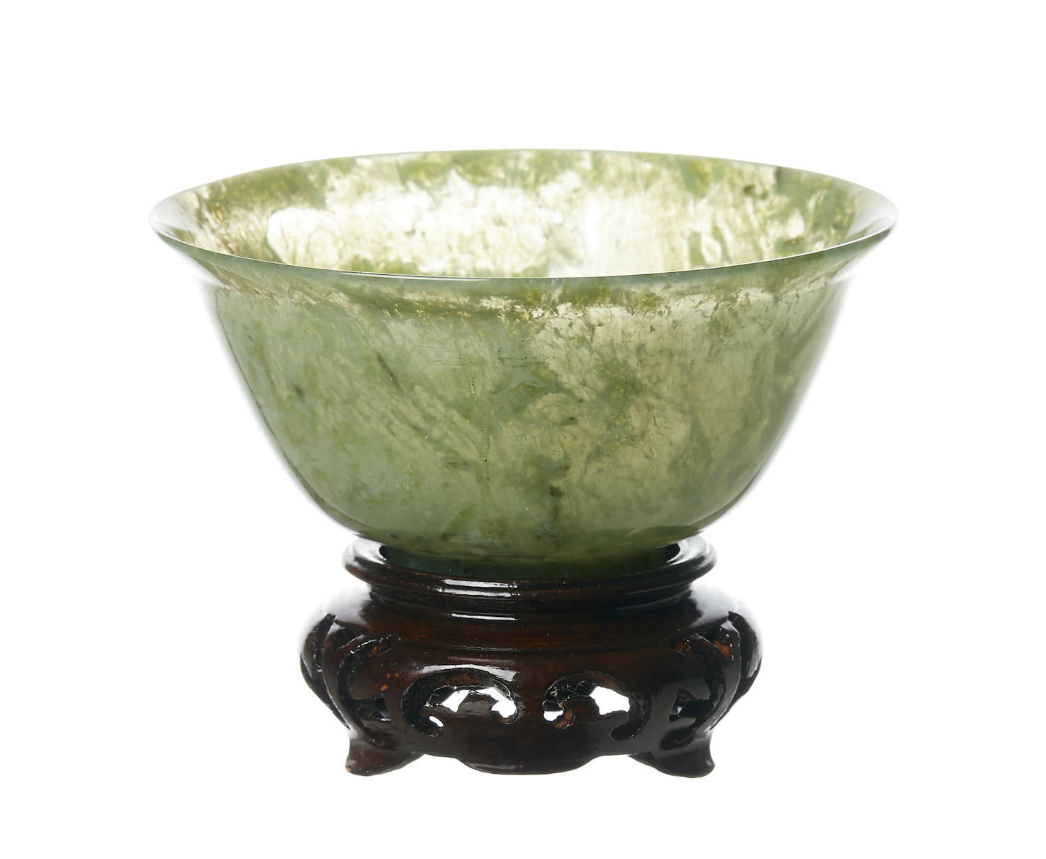 A FINE CHINESE CARVED JADE BOWL ON STAND IN BOX