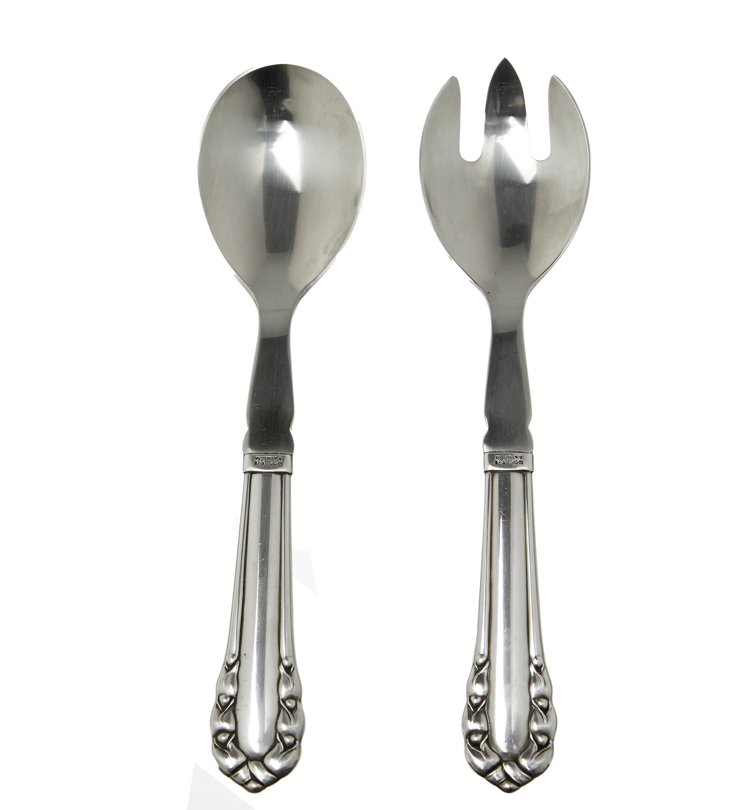 Sterling silver handled 'Lily of the Valley' pattern salad servers. Stamped 'Georg Jensen & Wendel A/S Sterling Denmark'.