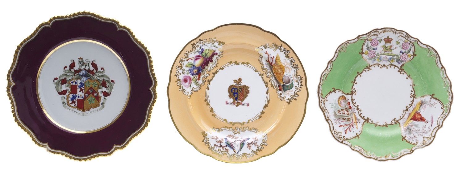 The first with a green border and three gilt-bordered reserves, one painted with a Chinoiserie scene, one painted with shells and the third painted with a Regimental cypher and the words "Buffs". The Buffs (East Kent Regiment) had a tour of duty in New South Wales from 1821-1827. Marked with the numeral 16 for the 16th recipe of Spode's Feldspar porcelain, circa 1832. The second plate with a peach border and three reserves of decoration, including shells, fruit and flowers and bird motifs, enclosing the arms of William Armitt of County Offlay, with motto 'Fortis in Ardvis'. Factory mark for Copeland & Garrett to reverse in green, and numbered 5405, alongside an impressed F. The third plate with a gadrooned gilt rim with a maroon border enclosing the Walmesley coat of arms, along with the motto 'Semper Fidelis'. Impressed and puce Flight, Barr & Barr factory mark to reverse.
