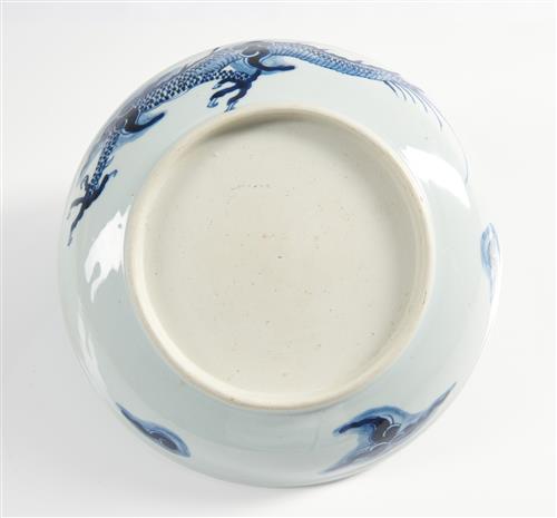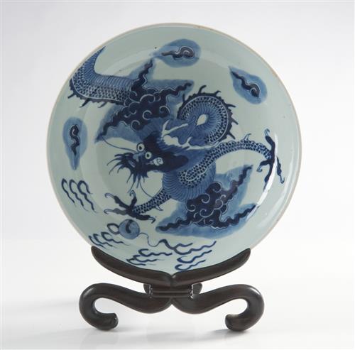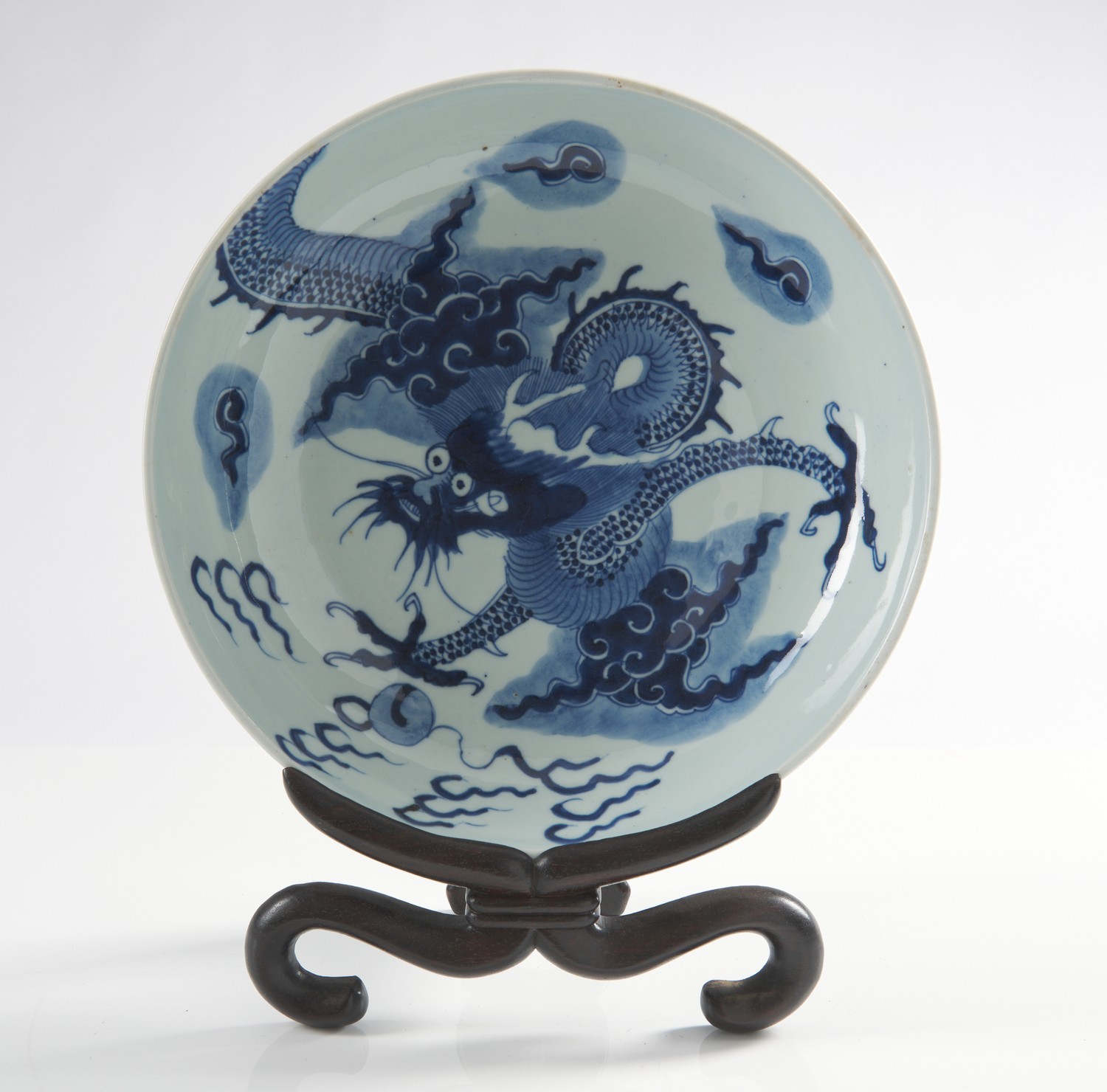 Decorated with a dragon chasing a flaming pearl surrounded by clouds. Together with a fitted old hardwood stand.